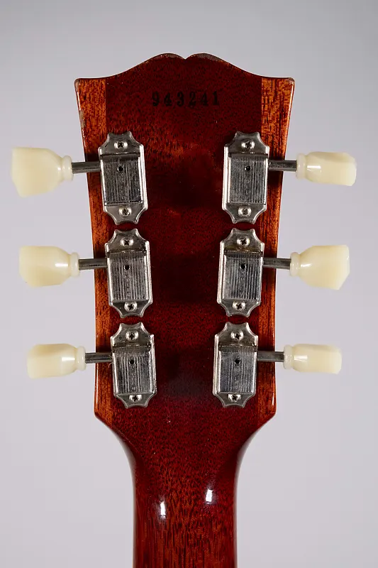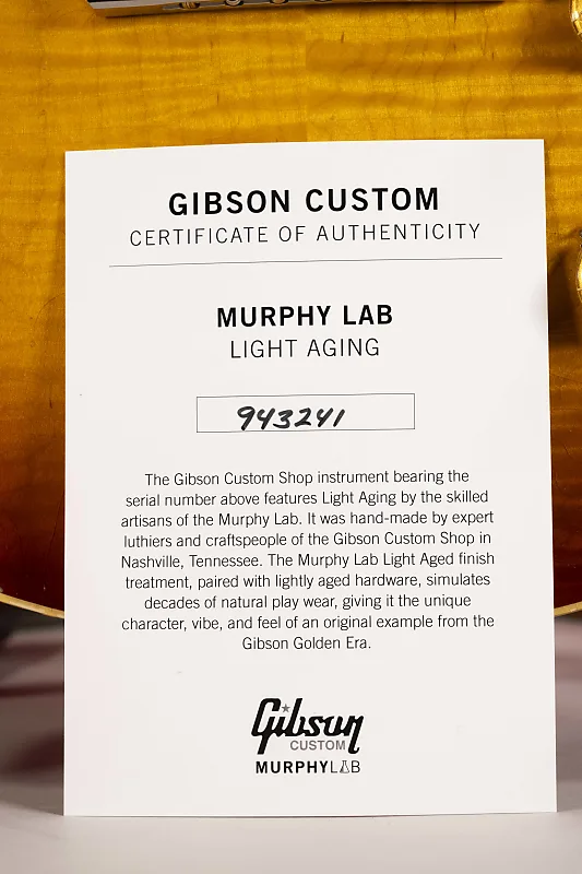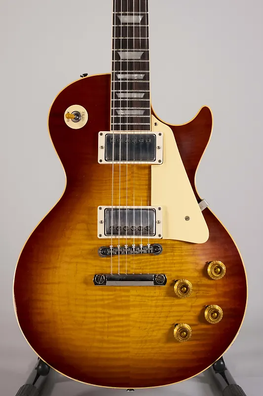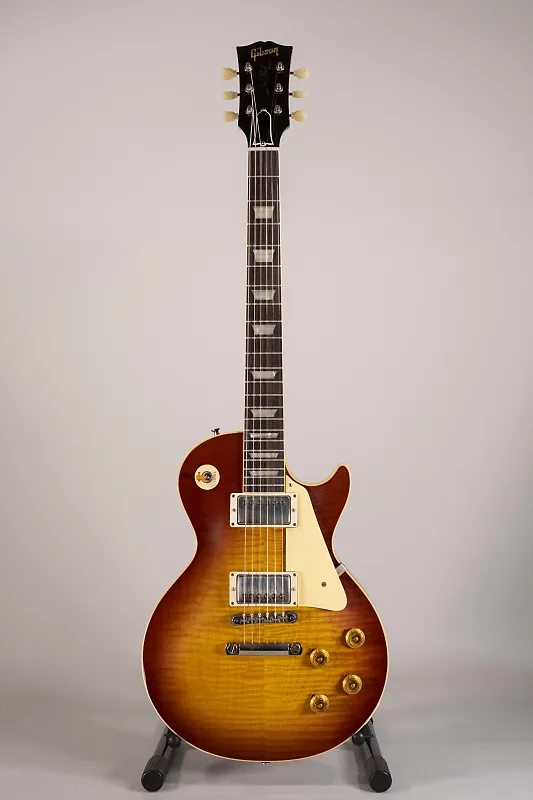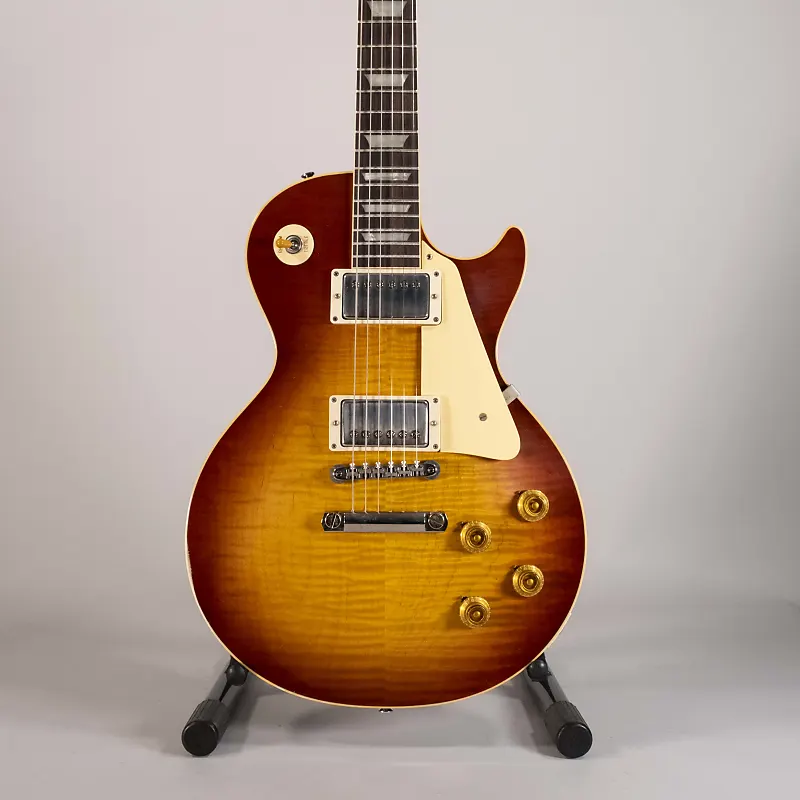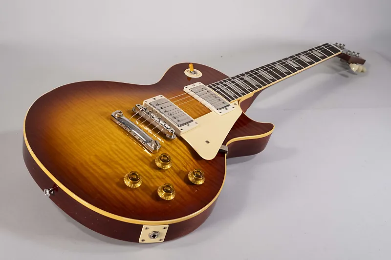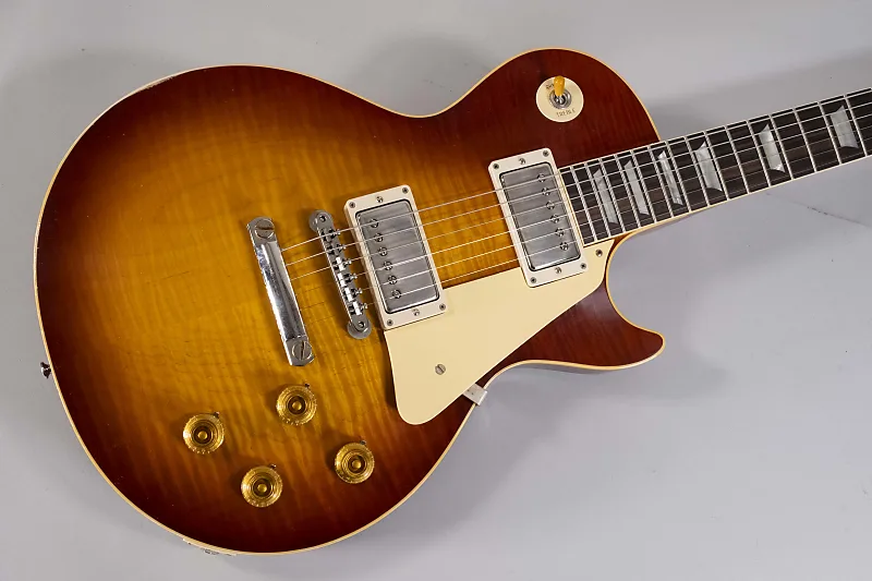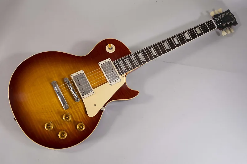 Форма корпуса: Les Paul Верх: 2-частная кленовая фігурная дека, приклеена на клей Задняя часть: цельная легкая махагони Окантовка: 1-слойный Royalite Отделка: нитроцеллюлозный лак, имитация старения Murphy Lab Light Гриф Материал: цельный махагони Профиль: аутентичный '59 средний C Длина мензуры: 24,75" Материал накладки: индийский розовое дерево, приклеено на клей Радиус накладки: 12" Ширина порожка: 1,687" Маркеры ладов: трапециевидные из целлюлозного нитрата Аппаратура Мост: ABR-1 Стопбар: облегченный алюминиевый Ручки: алюминиевые цилиндры с золотым бутиратом Колки: Kluson Single Line, Single Ring Покрытие: никель, имитация старения Murphy Lab Light Электроника Звукосниматель грифа: Custombucker Alnico 3 (без вакуумной пропитки) Звукосниматель моста: Custombucker Alnico 3 (без вакуумной пропитки) Регуляторы: 2 x CTS 500K конусные аудиопотенциометры, 2 громкости, 2 тона Селектор звукоснимателей: Switchcraft 3-позиционный Выходной разъем: Switchcraft 1/4" Прочее Струны: 10-46