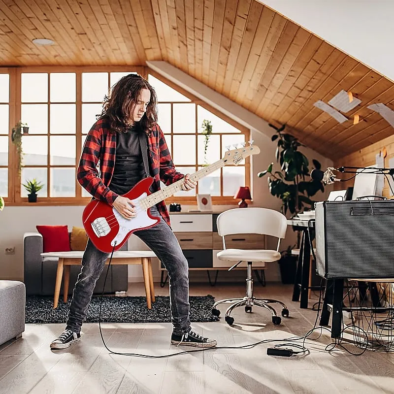 Эта бас-гитара идеально подходит для музыкантов любого уровня, от новичков до опытных исполнителей, и готова к использованию прямо из коробки. Также она поставляется с защитной сумкой, что делает ее отличным подарком для любого музыканта. повод.
