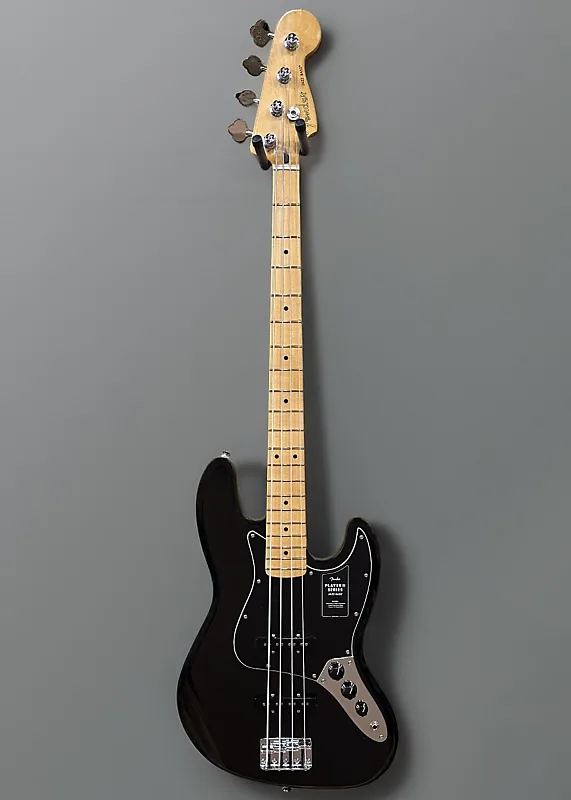 Черный, Сделано в Мексике, Глянцевое полиэфирное покрытие корпуса, корпус из ольхи, современный гриф из клена формы C с радиусом 9,5" и накладкой на гриф из клена с ладовыми порожками среднего размера, длина мензуры 34", ширина верхнего порожка 1,5", звукосниматели Player серии alnico 5 Jazz Bass на мосту и грифе с регуляторами громкости/громкости/тона, стандартный мост с цилиндрическими стальными седлами, стандартные колки с открытым механизмом, вес 8,8 фунта, чехол в комплект не входит