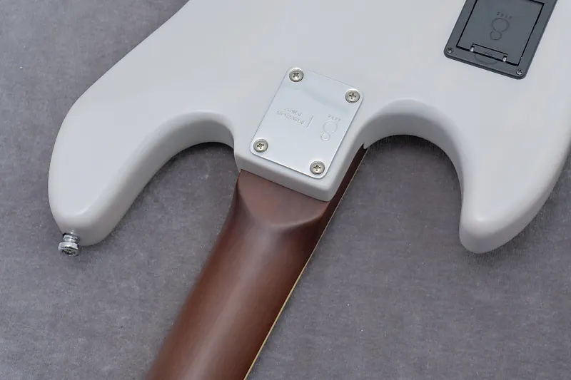 Гриф покрыт обожженным кленом, как и шея, но эта сторона окрашена в глянцевый цвет.