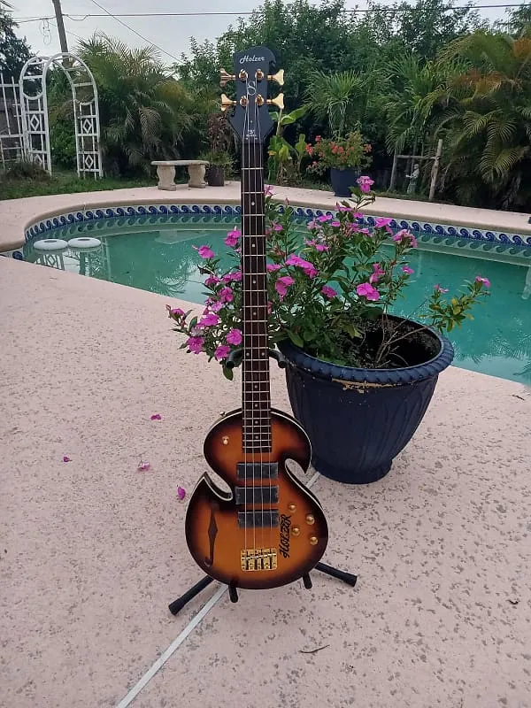 ЭТО РУЧНОЙ РАБОТЫ, БАСС-ГИТАРА С ТРЕМЯ ЗВУКОСНИМАТЕЛЯМИ. ОНА ПОЛУПУСТОТЕЛАЯ И ВЕСИТ ПРИМЕРНО 8 ФУНТОВ.