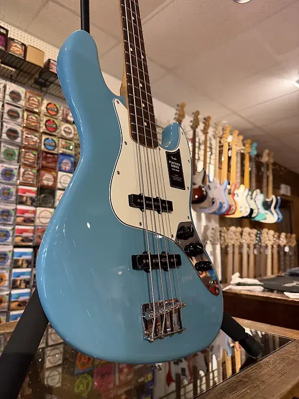 Новый пример бас-гитары Fender Player II Jazz Bass в отделке Aquatone Blue.