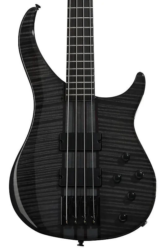 Электрический бас с корпусом из ольхи, верхней дека из клена, грифом из клена и пурпурного дерева, накладкой из розового дерева и двумя хамбакерными звукоснимателями - прозрачный черный.