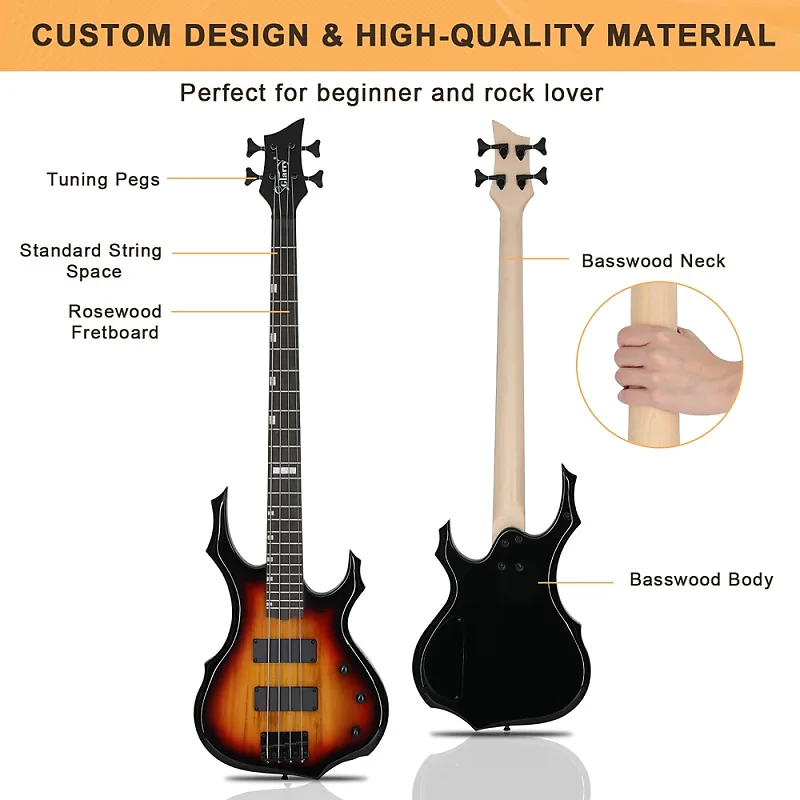 С деревянным и синтетическим корпусом с впечатляющей отделкой, этот полноразмерный электрический бас-гитар Glarry Burning Fire с 4 струнами обязательно привлечет внимание и станет ярким акцентом на сцене.
