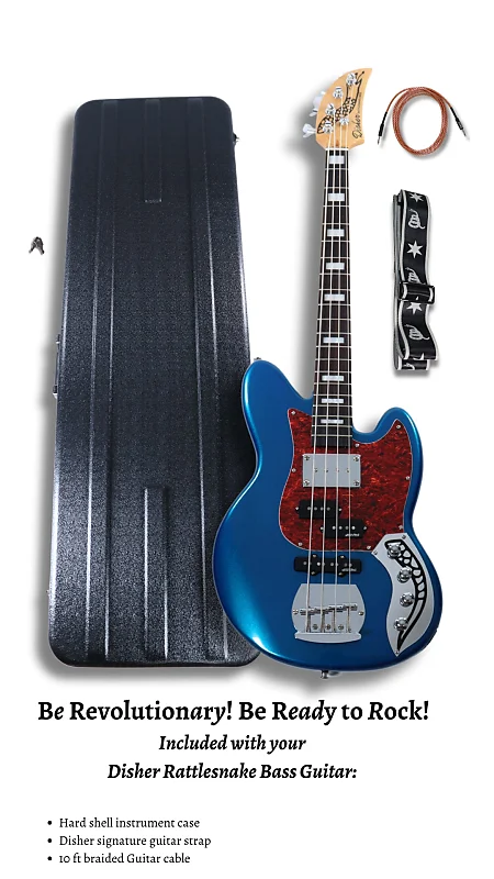 Бас Rattlesnake также комплектуется жестким кейсом из ABS от Disher, ремнем для гитары из нейлона/кожи Disher и 10-футовым плетеным гитарным кабелем.