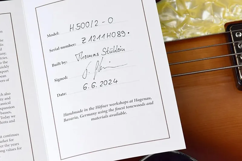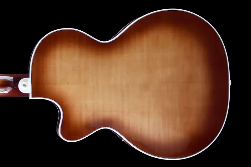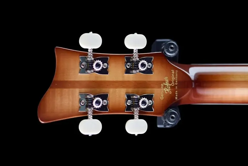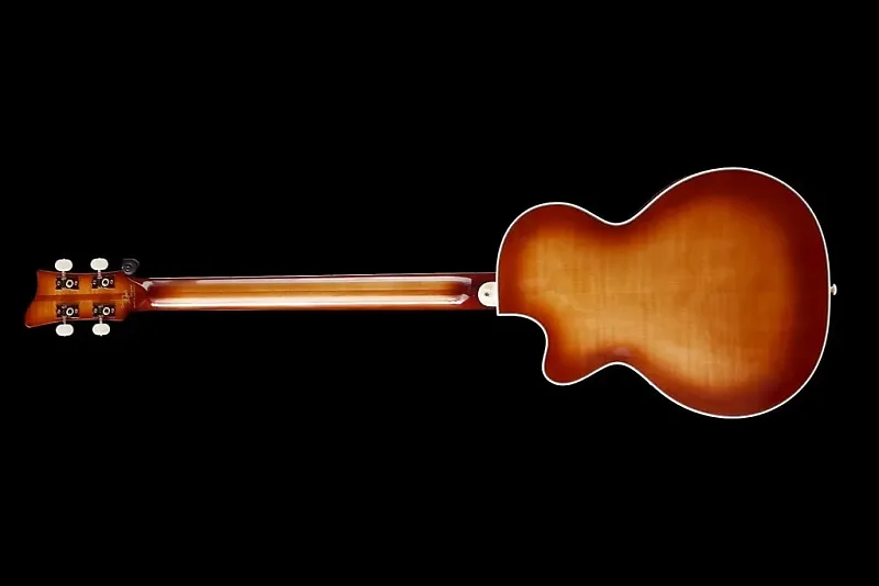 Сделано в мастерской на заказ в Хофнер небольшой командой мастеров. Этот бас оснащен верхней декой из ели и корпусом и обечайкой из кленового дерева с фактурой "пламя".