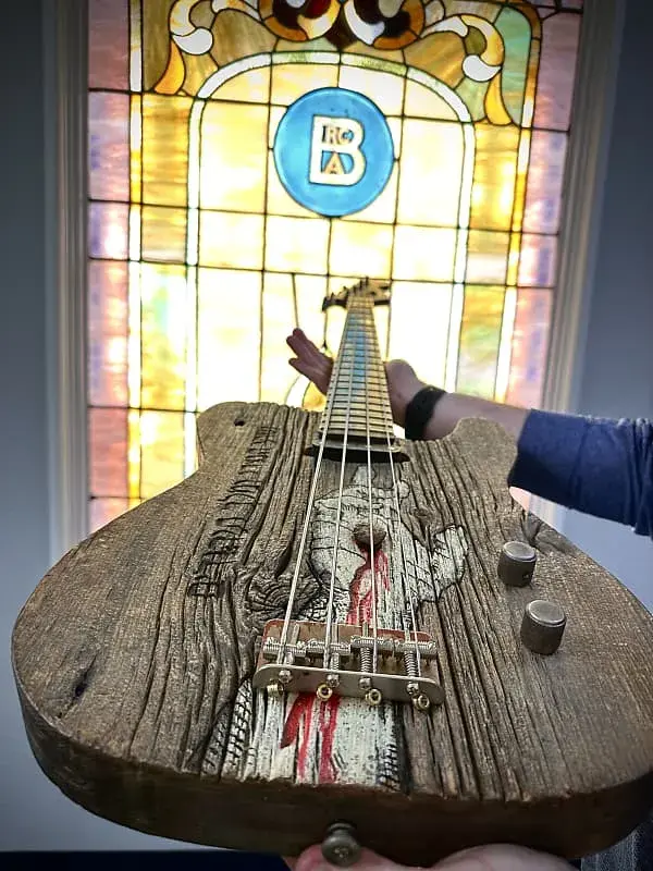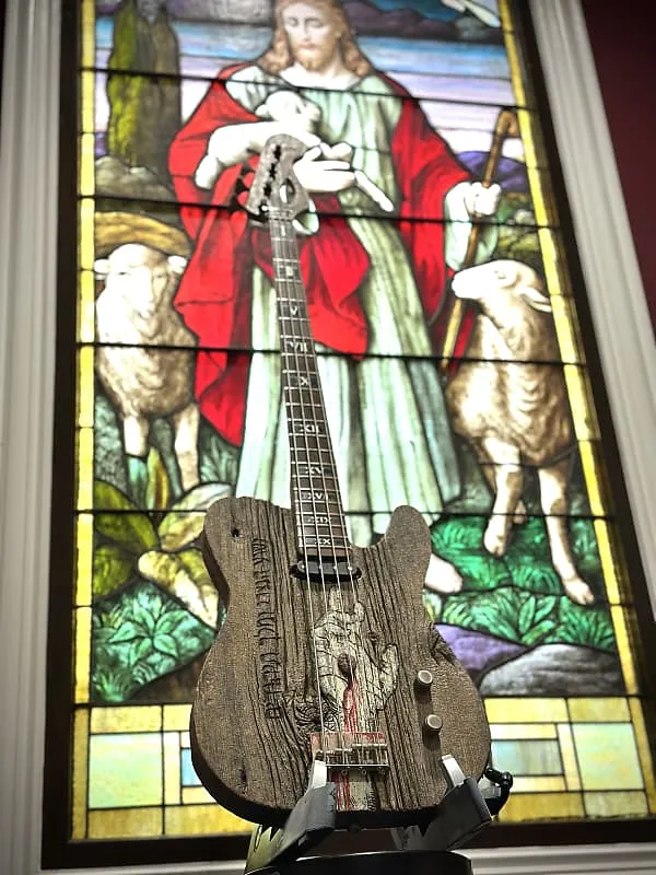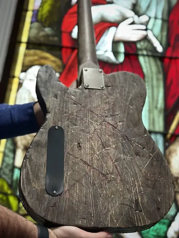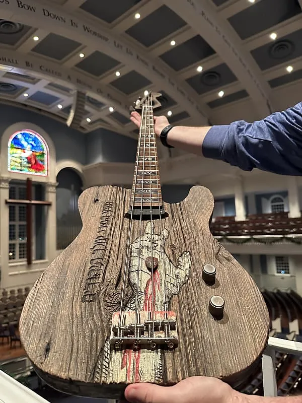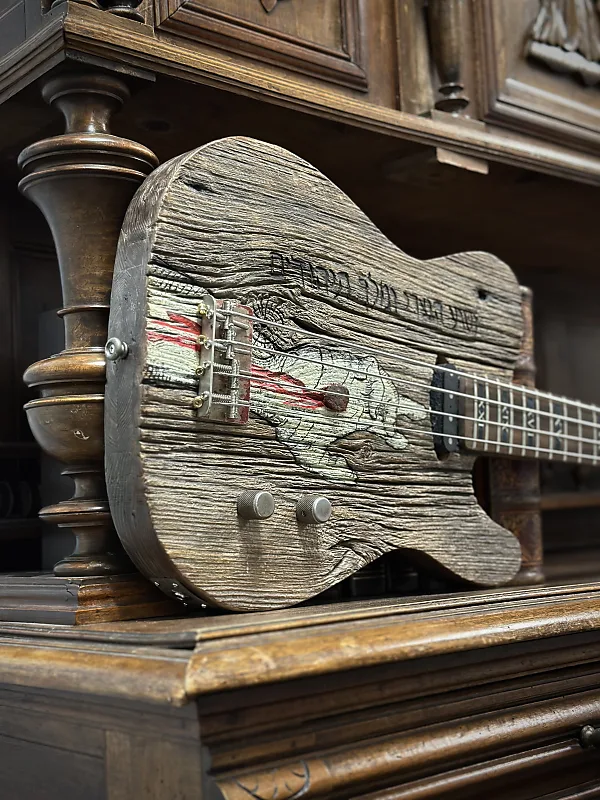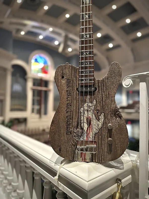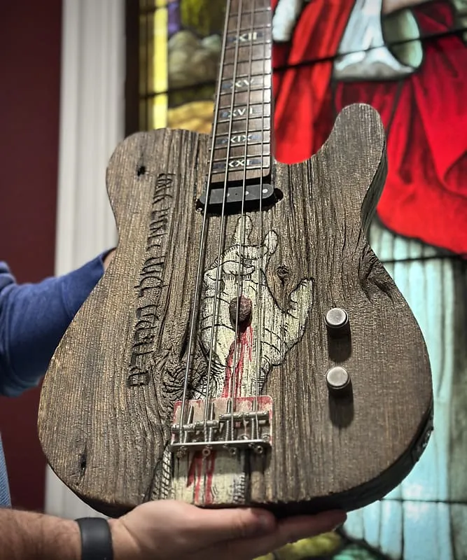 Бас-гитара в стиле TL - это уникальное творение, наполненное историей и мастерством. Построенная из 200-летнего восстановленного амбарного дерева, она символизирует Крест Христов и Распятие. Сложные детали, включая отметки ладов в виде римских цифр, состаренную фурнитуру и старинный гвоздь, вбитый через центральный мотив руки Иисуса, делают этот инструмент одновременно потрясающим произведением искусства и полностью функциональной, удобной и прекрасно звучащей бас-гитарой.