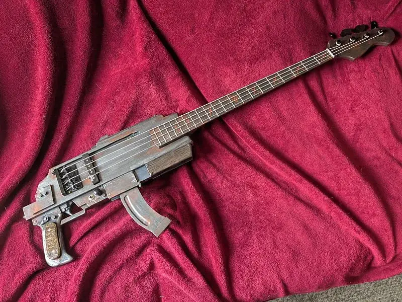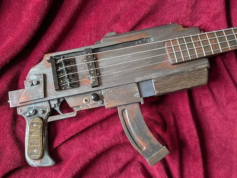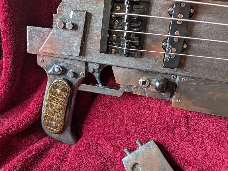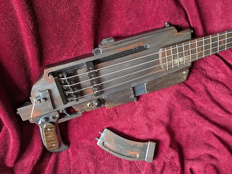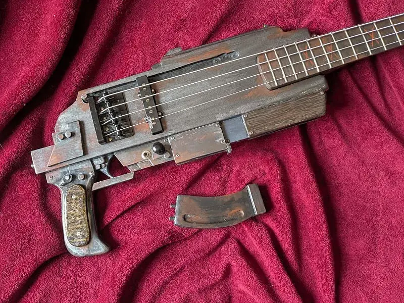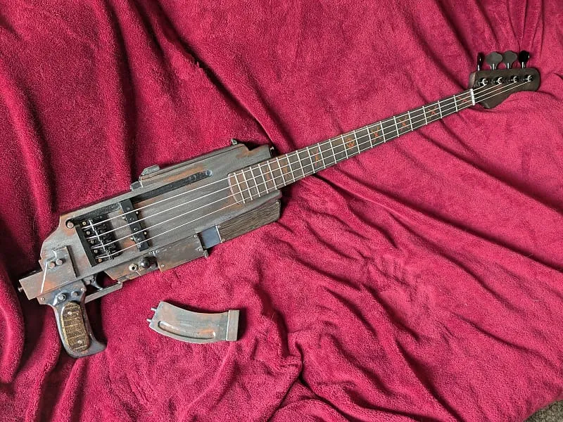 Представляем "The Guntar" - бас, созданный из моей любви к постапокалиптическим фильмам и драйвовым трекам! Ручная сборка корпуса из тополя с съемным зажимом, прицелами, окрашенными фанерными накладками и другими деталями.
