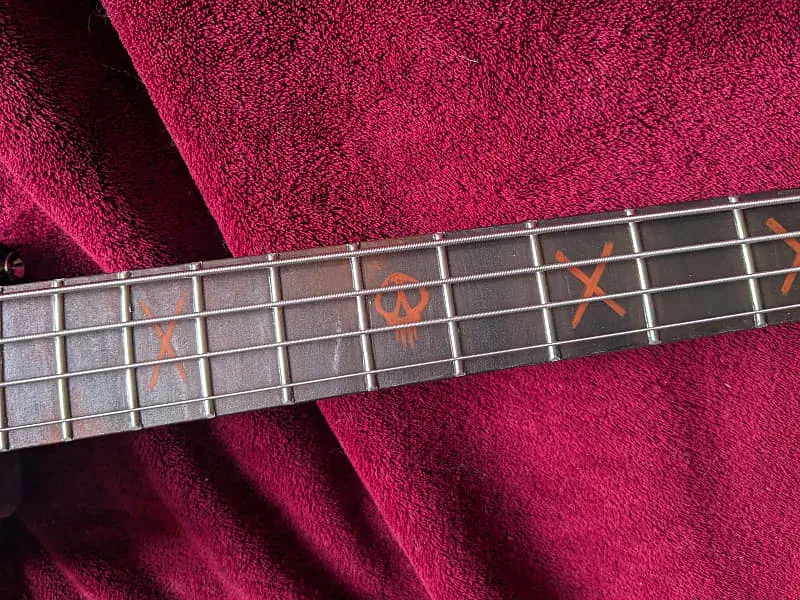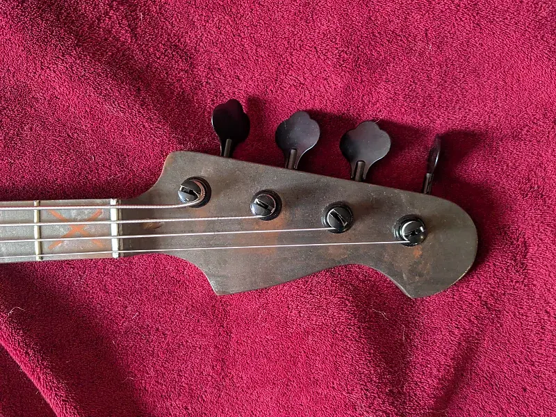 Гриф выполнен из клена в стиле J Bass от ребят из Solo Guitars, окрашен в соответствии с цветом Gun Metal серый с проржавевшими отметками ладов.