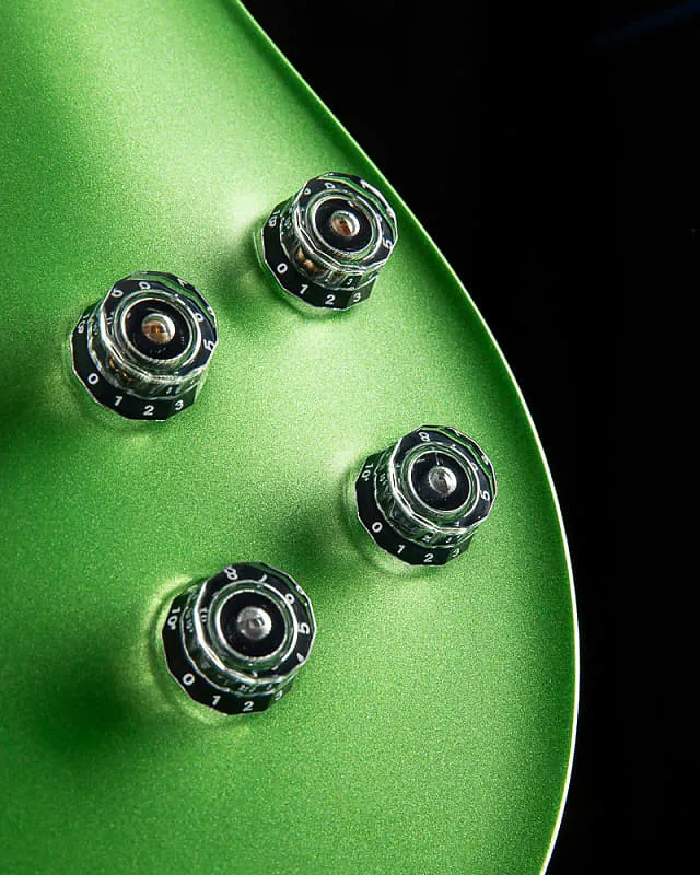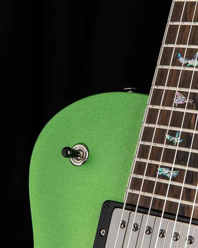 Эта модель McCarty 594 Singlecut имеет топ из Satin Jewel Lime на корпусе из красного дерева, гриф и накладку из розового дерева Восточной Индии, фурнитуру Smoked Black, инкрустацию из перламутровых птиц с контурами из Paua и звукосниматели PRS McCarty III Humbucker с покрытием Smoked Black.