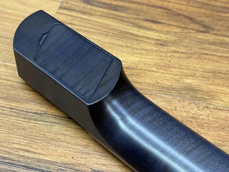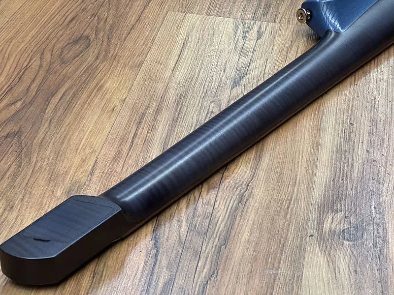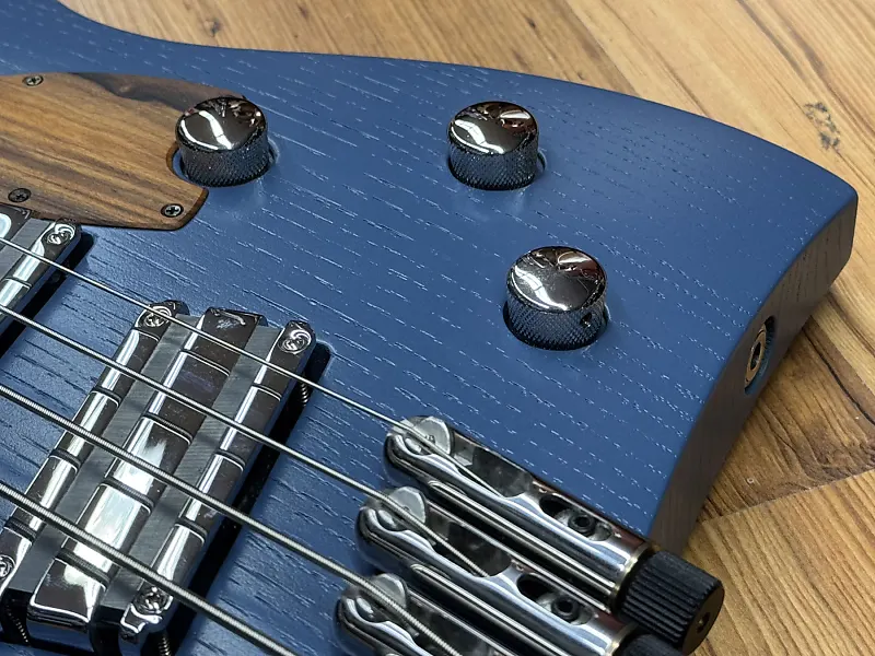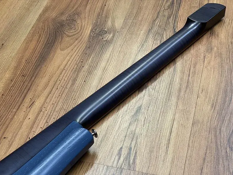 Гриф сделан из великолепного клена с выразительной текстурой, а темно-синий цвет выглядит невероятно стильно. Видно, что уделено много внимания эстетике, так как накладка на гриф, защитная пластина и задняя крышка выполнены из Pau Ferro.