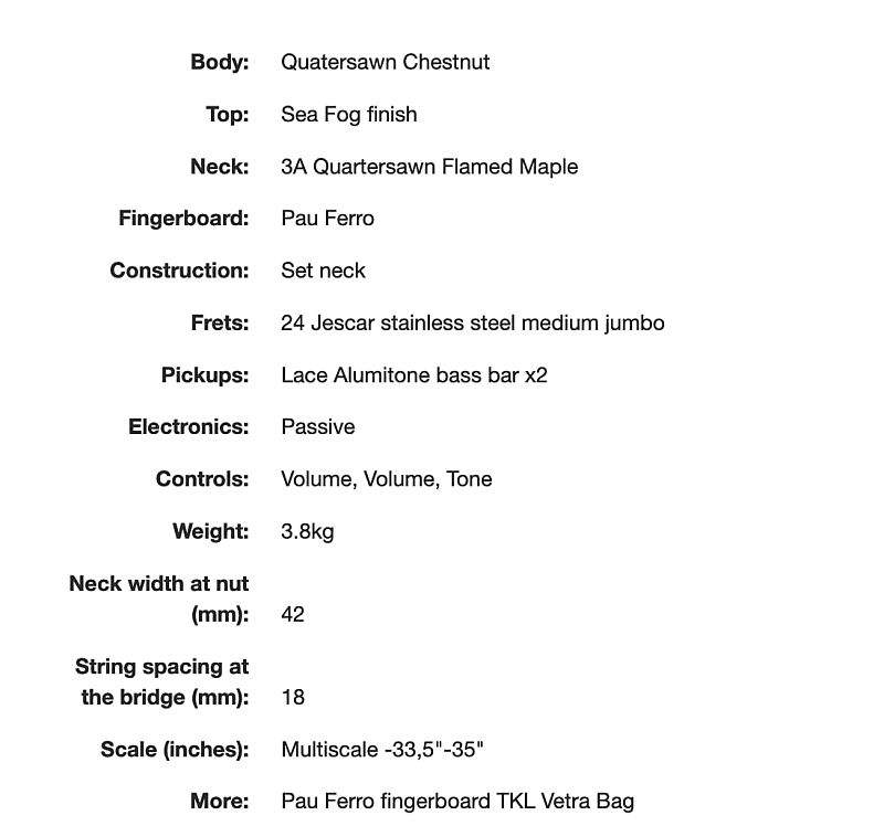Фреты с разной угловой постановкой (Fanned frets) Вся идея этой конструкции заключается в том, что каждая струна имеет свою собственную длину, что уравновешивает натяжение между высокими и низкими частотами, обеспечивая более качественный тон и интонацию. Это точно такой же принцип, как и у рояля, где низкие ноты требуют более длинных струн, чем высокие. Просто и эффективно. Мульти-шкала может показаться странной и сначала трудно играть, но на самом деле это очень естественный процесс для руки и запястья, чтобы привыкнуть к такому расположению ладов. На самом деле, требуется всего несколько минут (или вовсе незаметно), чтобы почувствовать себя с этим комфортно. Одиночный вырез и эргономичная форма Одиночный вырез делает гриф жестче с басовой стороны, уменьшая его упругость, что делает звучание более плотным и одновременно добавляет сустейн. В результате получается очень чистый и прямой тон при игре на низких нотах. Даже ноты ниже низкой B звучат полно и четко. В эргономические аспекты вложено много энергии и проведено множество исследований, поэтому выемки и форма - это не просто эстетический выбор. В первую очередь это эргономические решения, которые затем стали эстетическими. Форма следует функции. Уникальная форма создает инструмент, который можно держать на правой ноге (повседневная позиция), на левой ноге. (классическая позиция) без усилий. Бас останется у вас на коленях, не требуя поддержки руками и без ремня. Глубоко вырезанное корпус особенно оценится в положении стоя. Ребра, вырезанный пятый и подлокотник идеально подходят для тела музыканта, как перчатка.
