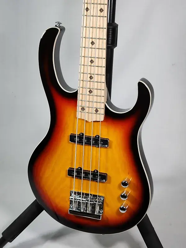 Винтажный бас-гитар 4 струны Vintage Burst - Глянцевая винтажная отделка, корпус с плоской верхней частью и удобными фасками, белая окантовка корпуса, прикручиваемая матовая грифовая панель из клена с 24 ладовыми накладками из клена и накладками DayStars, хромированная фурнитура, удобная ширина верхнего порожка 38 мм, пассивные звукосниматели открытого типа J/J, комплектуется фирменным мягким чехлом Moonwalk.