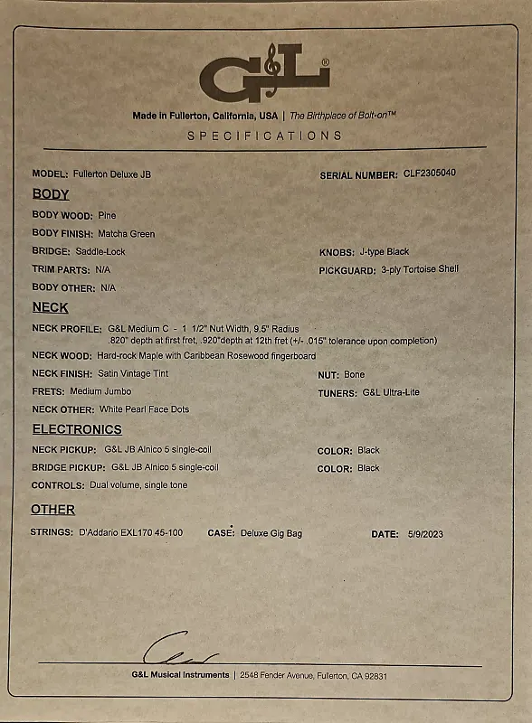 № 5040. В комплект входит роскошный мягкий чехол G&L Gig Bag. Вес = 9 фунтов 15 унций. Пожалуйста, смотрите приложенные фотографии и изображение сборочного листа. КОРПУС ИЗ СОСНОВОГО ДЕРЕВА, кастомный. Этот кастомный бас JB 4 струны 2023 года имеет опциональный корпус из сосны для насыщенного, традиционного звука и в сочетании с накладкой, которая идеально подчеркивает уникальный цвет. Это изящество продолжается вдоль грифа с полированным грифом G&L Natural Satin. Музыканты, любящие старую поговорку «если оно не сломано…», еще не играли на JB. Видите ли, G&L JB - это про изысканность, сочетание «святого Грааля» - звучания Alnico single-coil с современными улучшениями и превосходным мастерством. Этот JB излучает почтительно традиционное, но слегка прогрессивное настроение, уважая прошлое и не боясь двигаться вперед. Тонкий гриф из твердой кленовой древесины с легким в игре винтажным сатиновым финишем, а комфортный радиус 9 1/2″ и лады Jescar 57110 среднего размера из никель-серебра обеспечивают бархатистое ощущение игры. Более того, JB оснащен инновационной системой Saddle-Lock, разработанной Лео Фендером. мост для передачи струнной энергии прямо в торцевую часть корпуса для невероятно резонансного инструмента. Основанная Лео Фендером в 1980 году, компания G&L USA продолжает производить инструменты на историческом предприятии G&L на Фендер-авеню в Фуллертоне, Калифорния, родине болтового крепления.