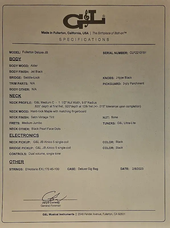 № 0151. В комплект входит роскошный мягкий чехол G&L Gig Bag. Вес = 9 фунтов 6 унций. Пожалуйста, посмотрите прикрепленные фотографии и изображение листа сборки. Двухструнный JB 2023 года производства Fullerton объединяет два классических сочетания из меню заказов G&L Option Order: корпус из ольхи для богатого, традиционного звучания и белый пикгард для идеального контраста. Элегантность продолжается вдоль шеи с отполированной шейкой G&L Natural Satin. Эта Black Beauty имеет следующие характеристики: