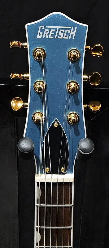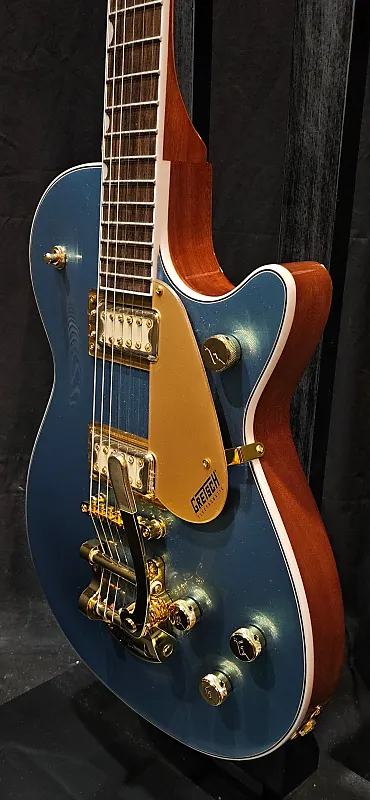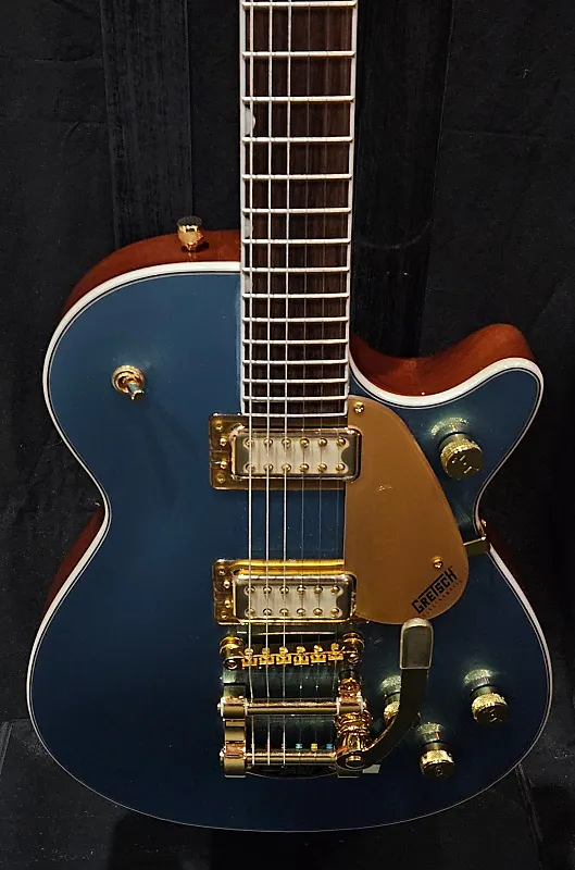 Двухцветная отделка с металлическими верхами и богатыми пятнами корпуса и грифы, золотая фурнитура и звукосниматели FT-5E Filter'Tron с кремовыми вставками создают гладкую, простую роскошь, которая, несомненно, привлечет внимание.