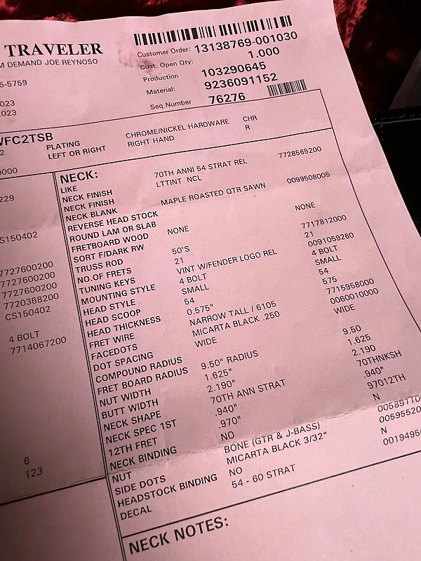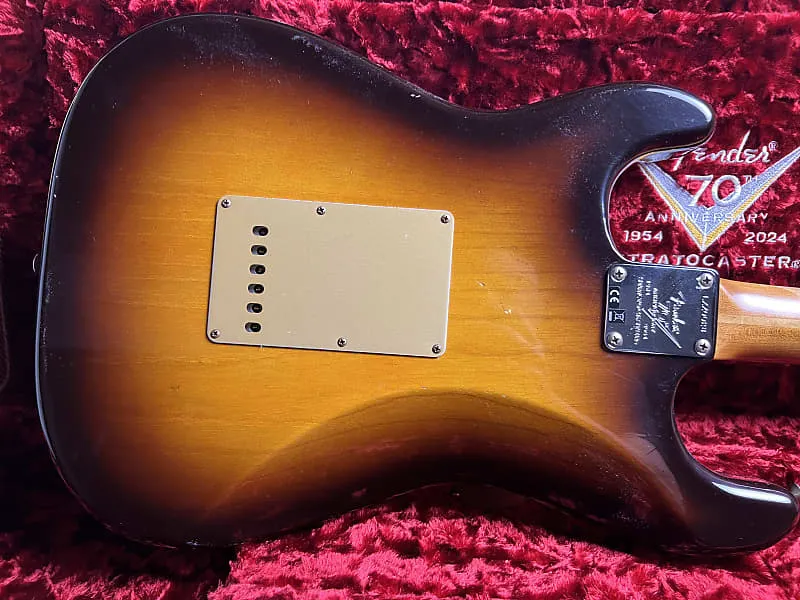 ГрифМатериал грифа: цельный клен с прожилками, обожженныйФорма грифа: 07/54 мягкая "V"Длина мензуры: 25,5" (64,77 см)Радиус накладки: 9,5" (241 мм)Количество ладов: 21Размер ладов: узкие высокие (6105)Костьорек: костьШирина у кости: 1,625" (41,3 мм)Головка грифа: StratocasterПластина грифа: 4 болта с гравировкой 70-летнего юбилеяОтделка грифа: нитроцеллюлозный лакНакладка: цельный обожженный клен с прожилкамиМаркерные указатели: черные микаратовые точки - 0,25"
