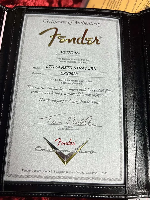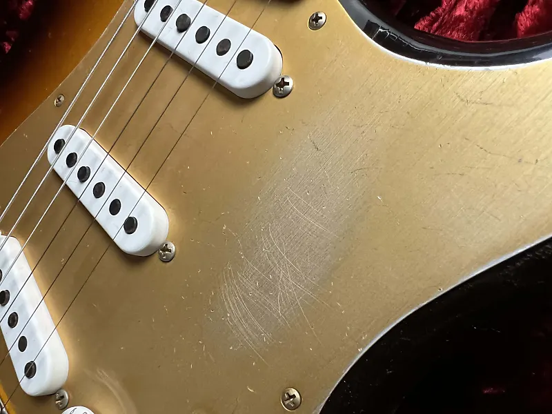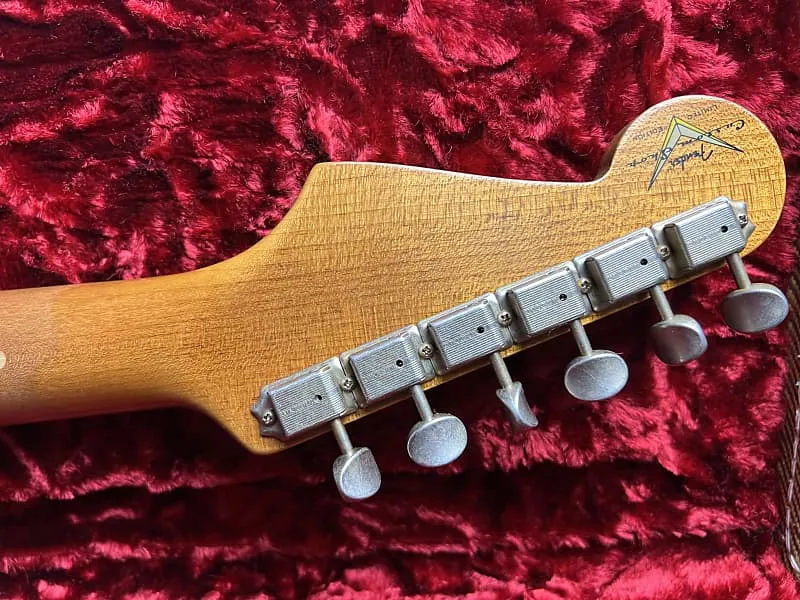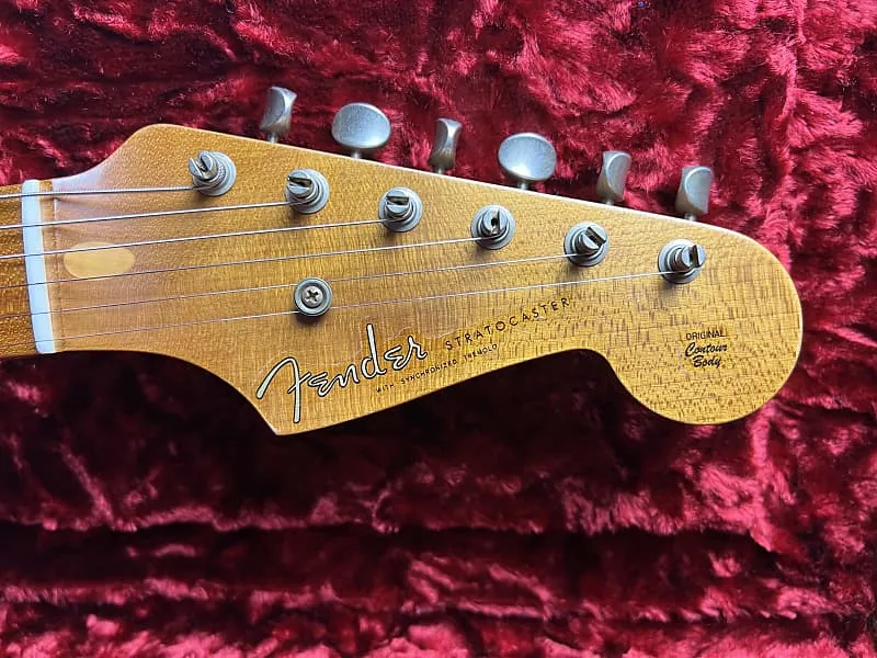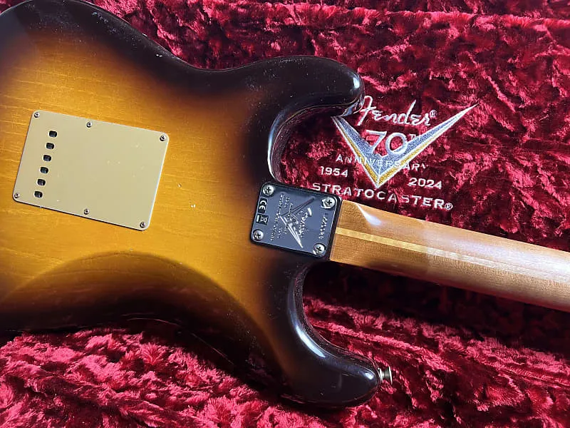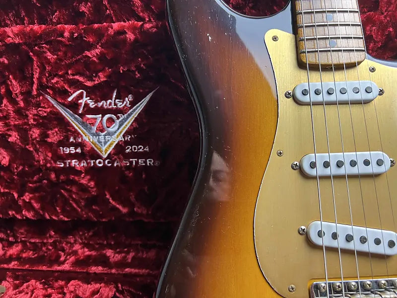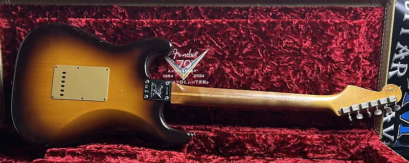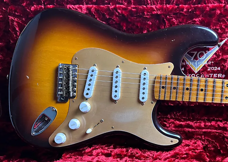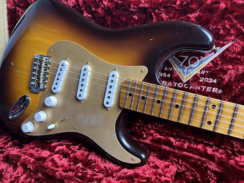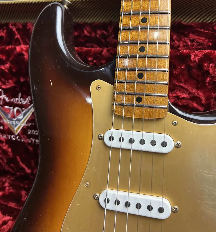 В целом это уникальное сочетание эстетики, вдохновленной 1950‑ми, с другими премиальными функциями, включая восьмилостовую позолоченную накладку, крышки звукоснимателей и органы управления в стиле 1954 года из ABS белого цвета, тремоло Custom Shop vintage, тюнеры в винтажном стиле, дисковый струнодержатель, специальную накладку на шейку Stratocaster в честь 70-й годовщины, роскошный жесткий футляр с вышивкой, ремень и сертификат подлинности.