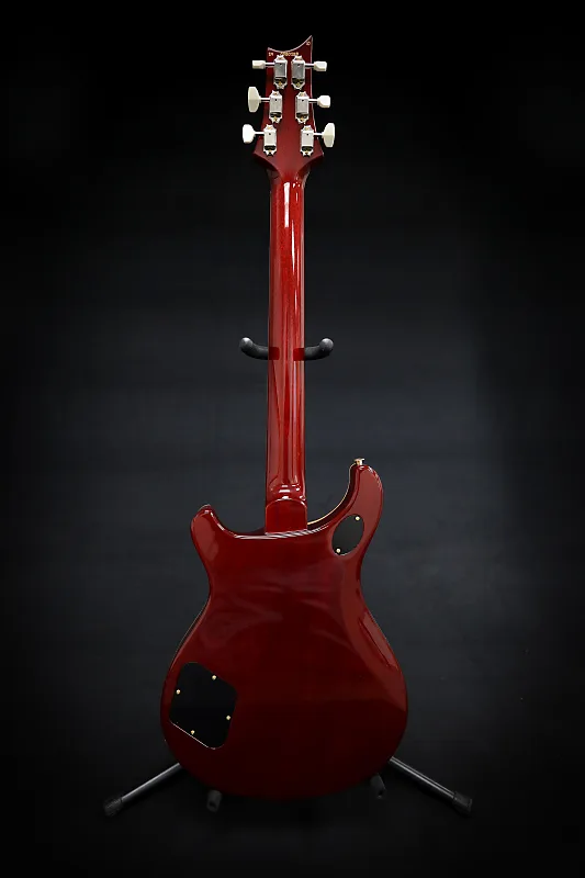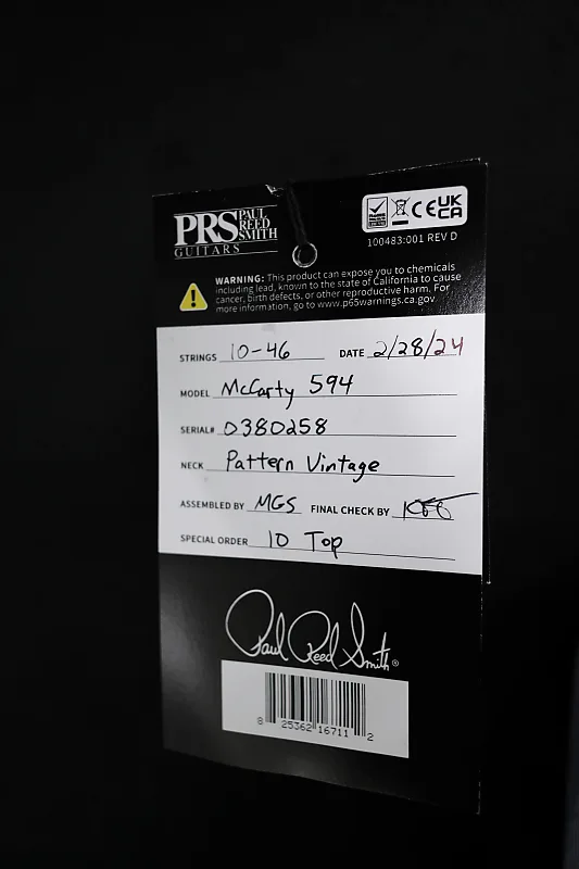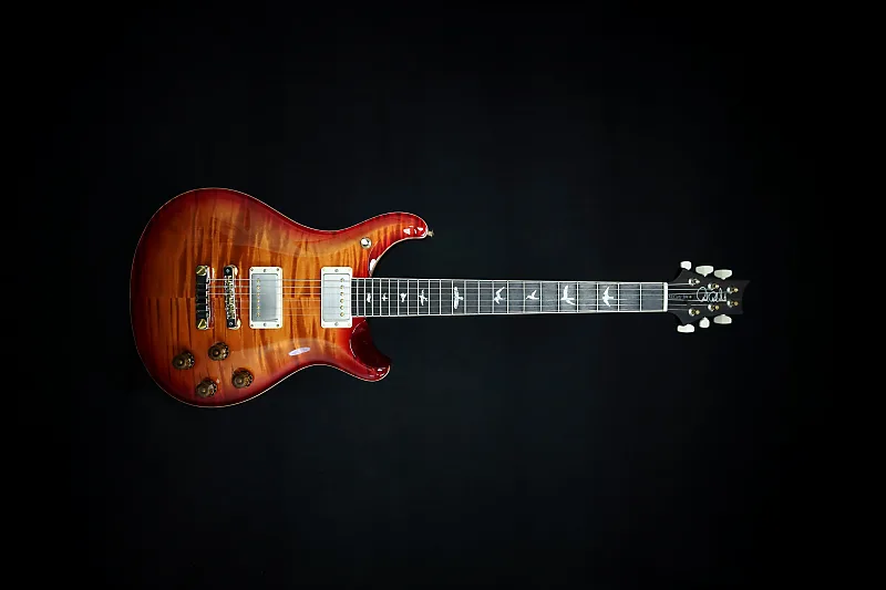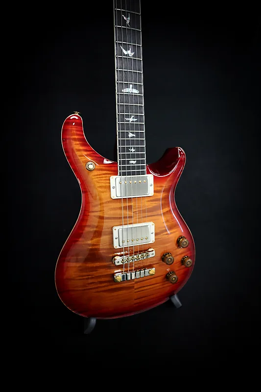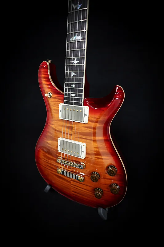 McCarty 594, кленовое верхнее покрытие Flame Maple 10, темно-вишневый солнечный градиент, задняя часть из махагони, гриф из махагони, накладка грифа и шпон из индийского розового дерева, отметки в виде птиц, вырез Pattern Vintage, двухсекционный стоперайль, гибридная фурнитура, звукосниматели 58/15 LT TCI, жесткий футляр.