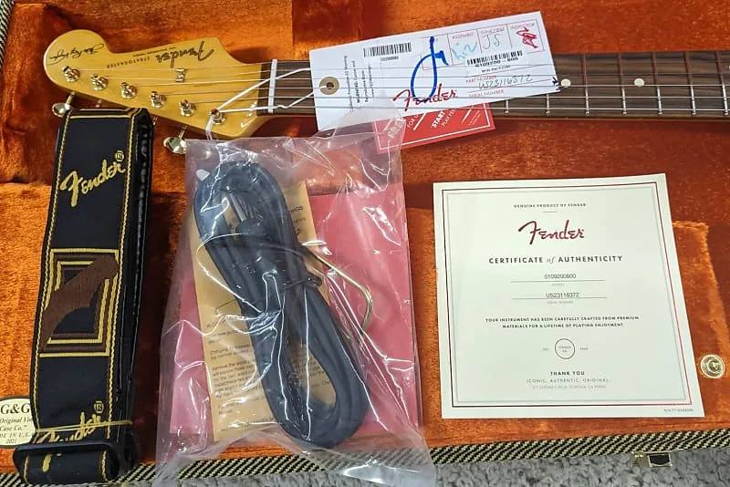 - Особенности - глубокая, толстая овальная шея, позолоченная винтажная фурнитура, гравированная накладка SRV, левосторонний американский винтажный тремоло
