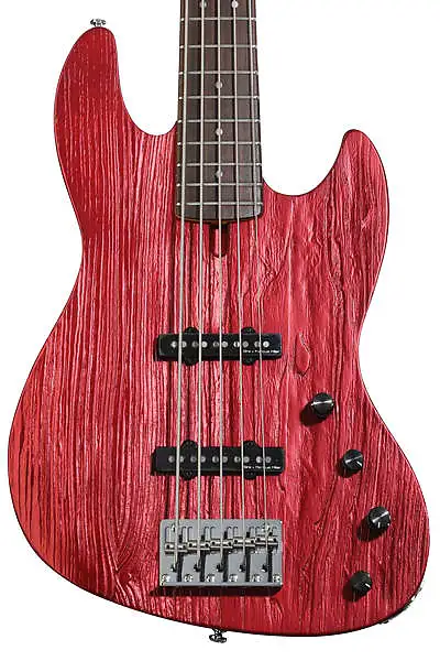 5-струнная электрическая бас-гитара с корпусом из махагони, верхней деки из ясеня, грифом из клена, накладкой грифа из палисандра и двумя одношпульными звукоснимателями - цвет «Конфетно-яблочный красный».