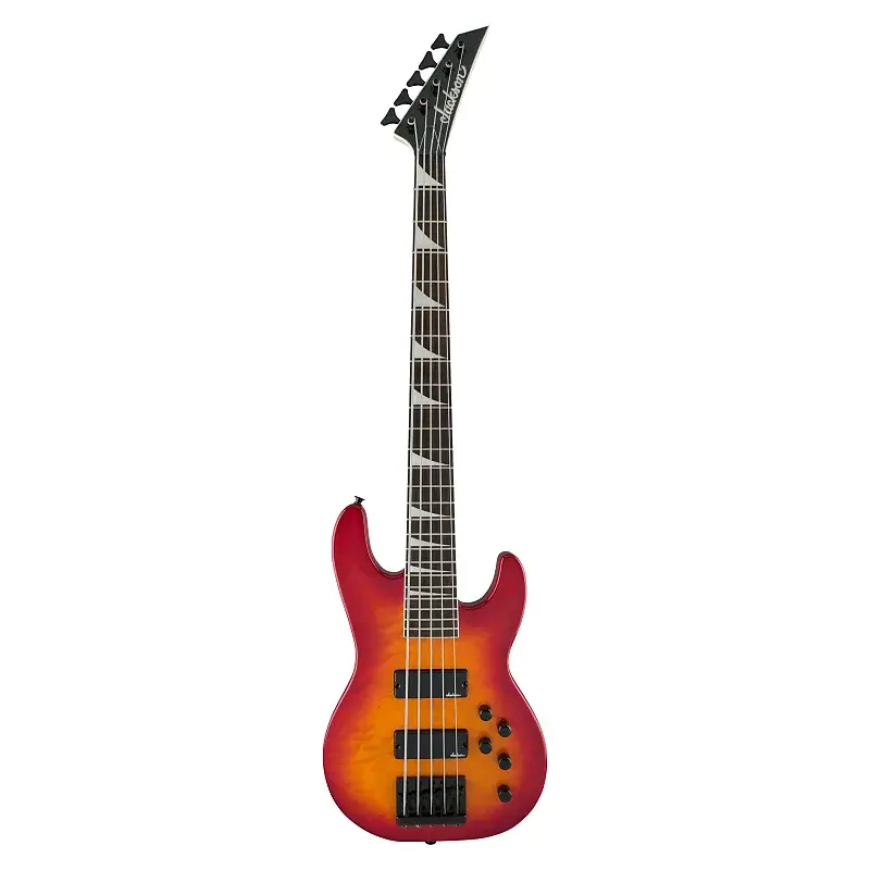 Громогласная бас-гитара с характером и ценностью, JS3VQ доступна в эффектной отделке Cherry Burst, Transparent Black Burst или Transparent Red Burst с черной фурнитурой и головой Jackson с пятью колками в линию и остроконечной формой.