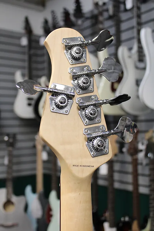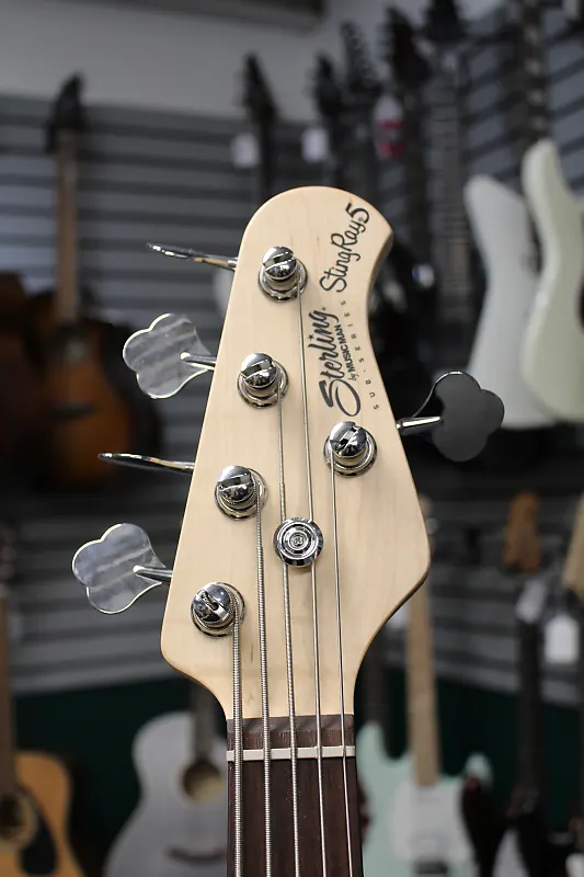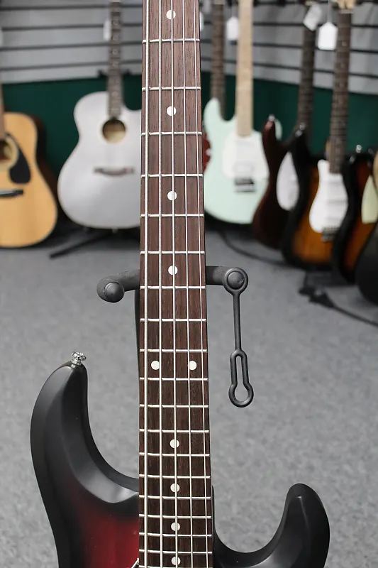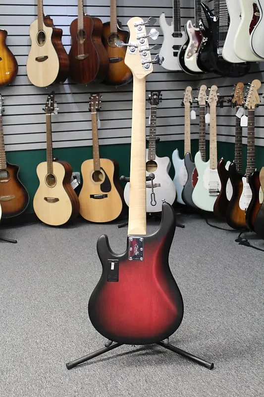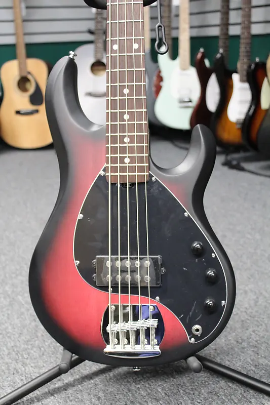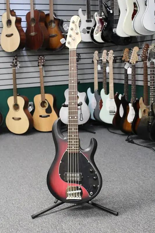 Абсолютно новый электрический бас Sterling Stingray с 5 струнами. Выполнен в темно-красной и черной окраске «sunburst» с черной накладкой на корпусе.