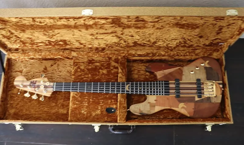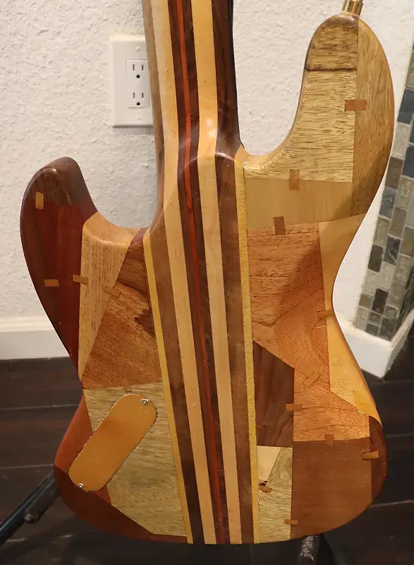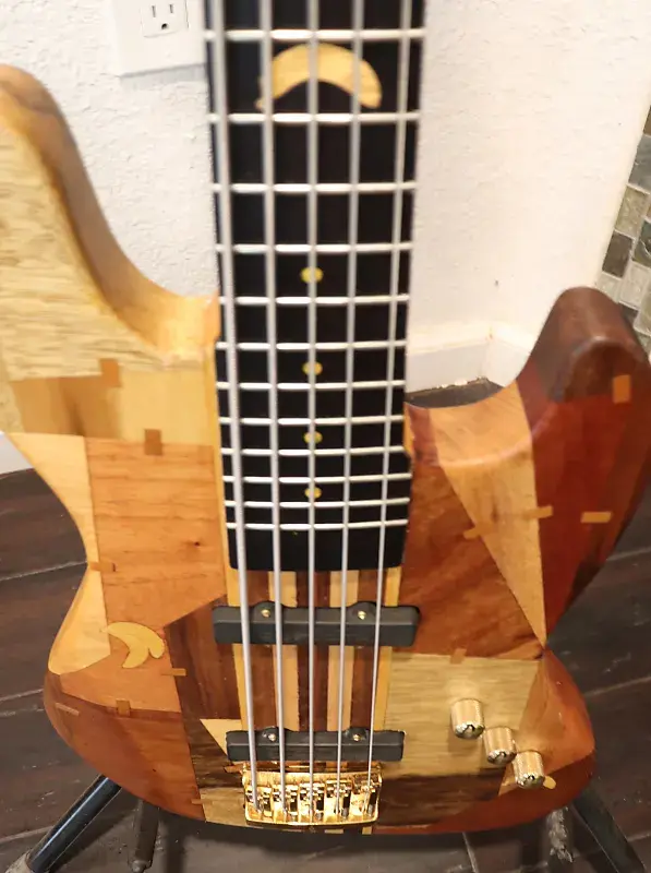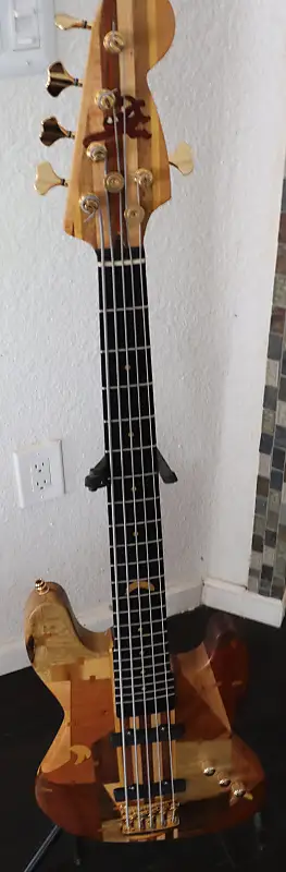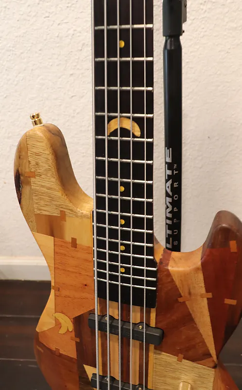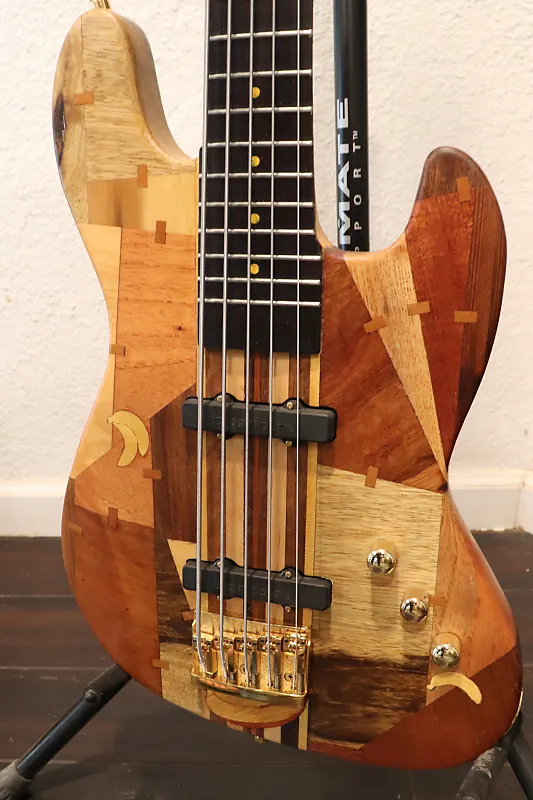 Корпус выполнен из подбора светлых экзотических пород дерева - черная лимба, испанская кедровая древесина, ольха, красное дерево, бук, а инкрустация в виде бананов сделана из yellowheart. Маленький персонаж на головке грифа выполнен из бубинги с глазами и ртом из стеклянной крошки. Покрытие - монокоат (на самом деле hexacoat) масло, которое затвердело до твердого и гладкого финиша. Это инструмент, от которого реально можно «сойти с ума»!