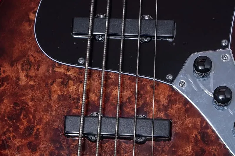 Задняя часть корпуса сделана из индонезийского красного дерева, а верхняя - из кленового шпона Burl.