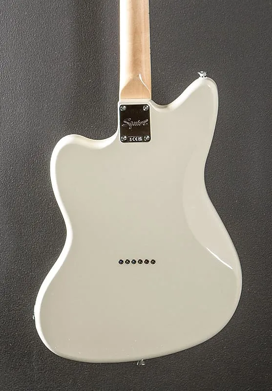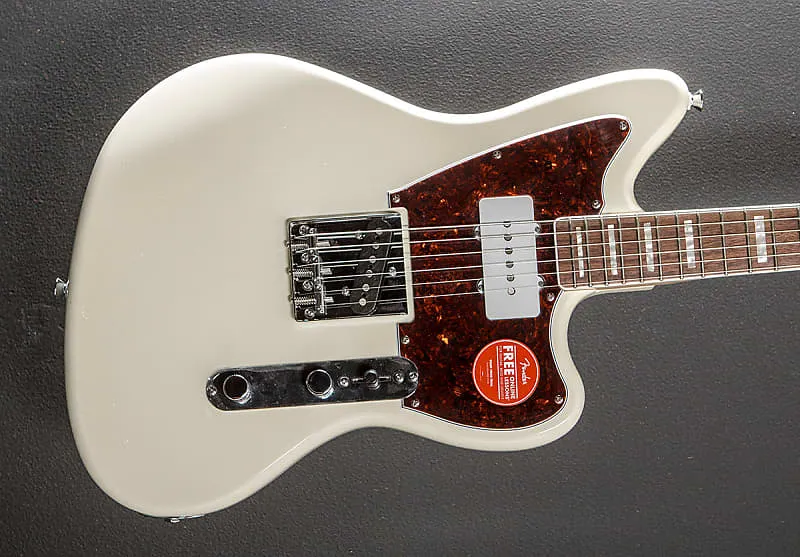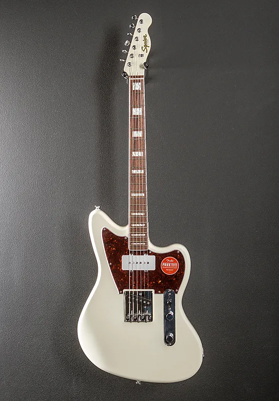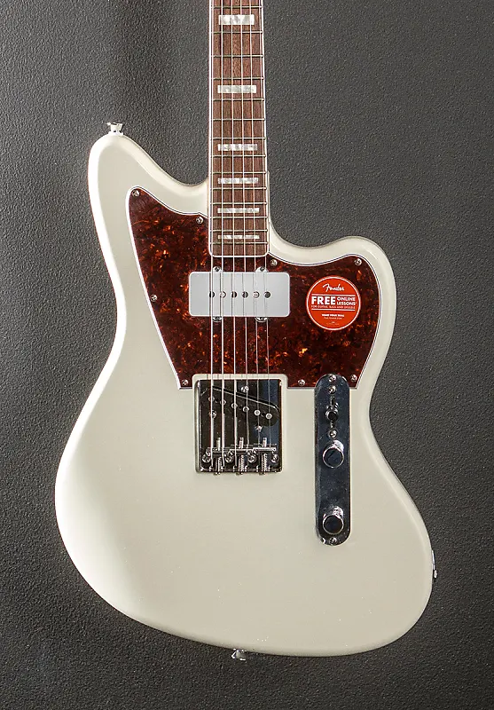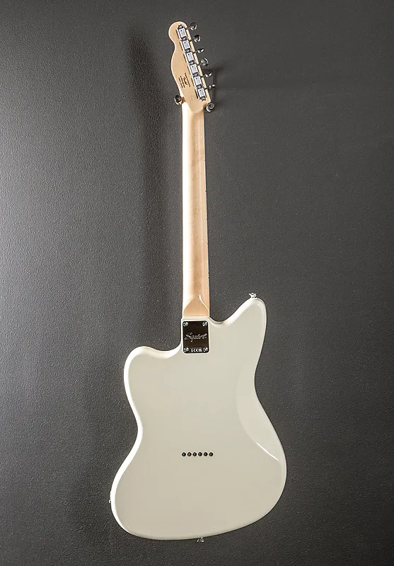 Olympic White с Соответствующая головка грифа, изготовлено в Индонезии, блестящее полиуретановое покрытие, корпус из тополя, гриф из клена формы C, облицованная 9,5-дюймовая накладка из индийского лаурела с перламутровыми прямоугольными вставками и узкими высокими ладами, длина мензуры 25,5 дюйма, ширина порожка 1,650 дюйма, звонкие сингл-коилы Fender Alnico для телемостового бриджа и Джазмастерного грифа, 3-позиционный переключатель с push/pull регулировкой громкости и тембра, ручка push/pull громкости выбирает подключение звукоснимателей последовательно (вверх) и параллельно (вниз) во 2-й позиции, ручка push/pull тембра выбирает фазу звукоснимателей: в фазе (вниз) и против фазы (вверх) во 2-й позиции, телемостовый струнопровод с тремя стальными бочковыми седлами, тюнеры винтажного стиля, вес 8,4 фунта, кейс не включен.
