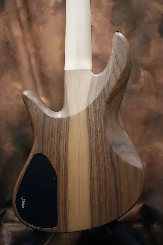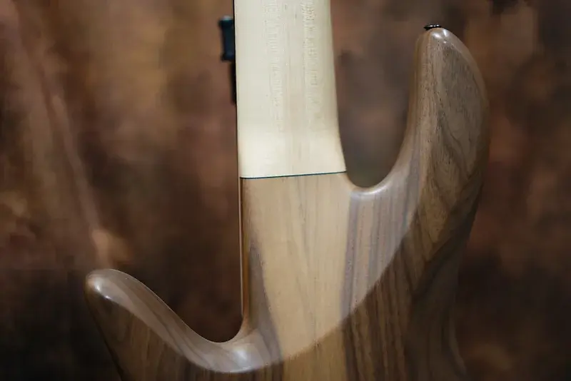 сквозной гриф.С двухсекционным корпусом из ореха создается впечатление, что кленовый гриф будто напрямую соединяется с корпусом! Дизайн настолько типичен для Fodera, что вызывает улыбку.