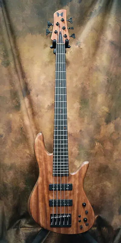 Бабочка также сделана из эбена, так что это стильный двухцветный Fodera с красновато-коричневой бубингой, черными деталями и эбеном.