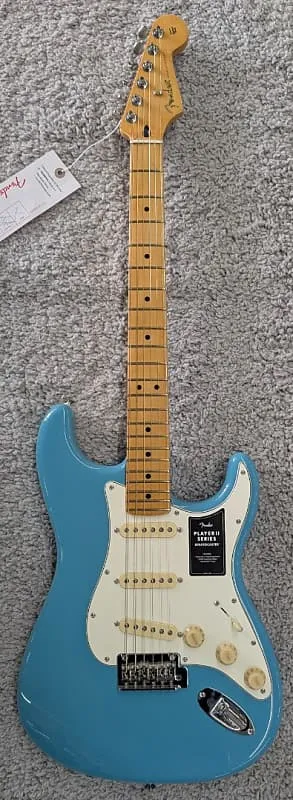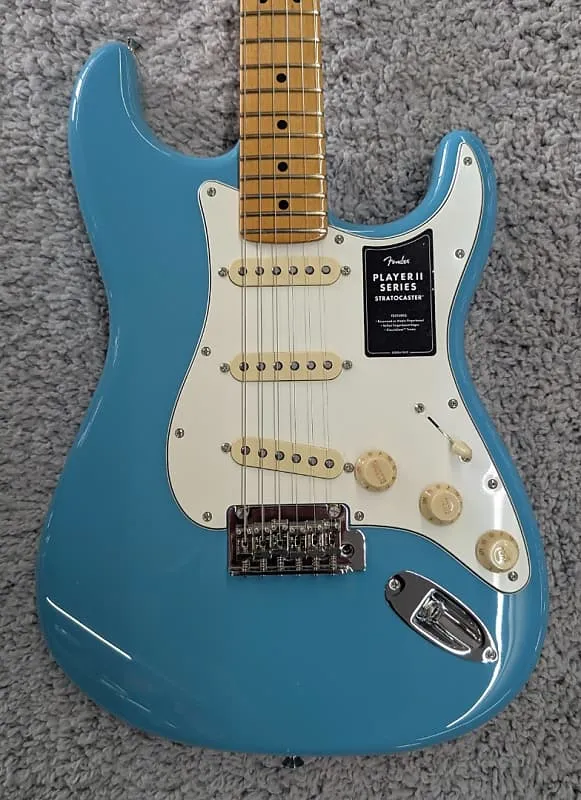 Гитара Fender Player II Stratocaster, гриф из клена, цвет Aqua Tone Blue - MIM Этот экземпляр имеет серийный номер MXS25028580 и весит 7 фунтов 15,7 унцийСовершенно новая серия Player II развивает чрезвычайно популярную формулу серии Player. Новые особенности Player II включают ранее не использовавшиеся винтажные автоцвета, грифы из палисандра, усовершенствованные бриджи и фурнитуру, закругленные края грифа, новый оттенок шейки, состаренные пластиковые детали, а также новые варианты корпуса из резонирующей ясеневой и камерной махагониевой древесины. Сохраняя суть того, что сделало оригинальную серию великой - звукосниматели Player, современные шеи формы «C», грифа с радиусом 9,5 дюйма и средние джамбо ладовые порожки, новая серия Player II расширяет эту прочную основу за счет широкого диапазона улучшений и новых опций. Созданная для музыкантов, готовых сделать следующий шаг в их музыкальном пути, Player II становится новым эталоном доступного качества и производительности.Вот некоторая информация об этой конкретной гитаре. Корпус - Ольха Отделка корпуса - Глянцевый полиэстер Aqua Tone Blue Гриф - Клен - Современная форма «C» Отделка грифа - Сатиновый уретан на задней части грифа и глянцевый уретан на передней Накладка на гриф - Цельный клен, 9,5” (241 мм) Лады - 22, средний джамбо Маркеры позиций - Черные точки Материал и ширина порожка - Искусственная кость, 1,650” (42 мм) Колки - Классические колки Fender Длина мензуры - 25,5” (64,77 см) Мост - 2-точечный синхронизированный тремоло с седлами из гнутой стали Звукосниматели - Серия Player II Alnico 5 Strat Single Coil Переключатель звукоснимателей - 5-позиционный Регуляторы - Главная громкость, Тембр 1, Тембр 2 Ручки - Пластик «старой белизны» Фурнитура/отделка - Никель/Хром Струны - Fender USA 250L никелированная сталь .009-.042 Чехол или сумка - ОТСУТСТВУЕТ