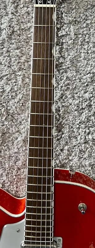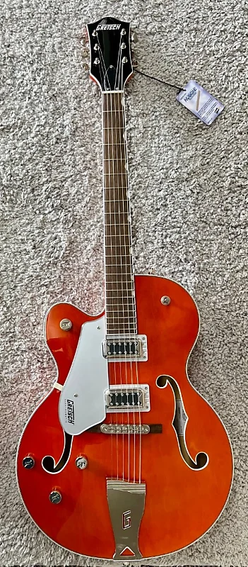 Живой и резонансный, леворукий G5420LH также обладает универсальной модернизированной схемой управления, включающей общий регулятор громкости с цепью требл-блееда, общий тон, индивидуальные регуляторы громкости для звукоснимателей и трехпозиционный переключатель звукоснимателей, увеличенные окантованные F-образные отверстия, многослойную окантовку корпуса, уменьшенную головку в стиле поздних '50-х G6120 с окантовкой, тюнинговые механизмы винтажного типа с открытой задней частью, кость Graph Tech NuBone, перламутровые накладки Neo-Classic на ладони в виде заклепок, надежный мост Adjusto-Matic и хвостовую деталь Gretsch G-cutout.