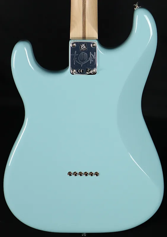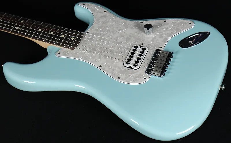 Это электрогитара Fender Limited Edition Tom Delonge Artist Daphne Blue Stratocaster.