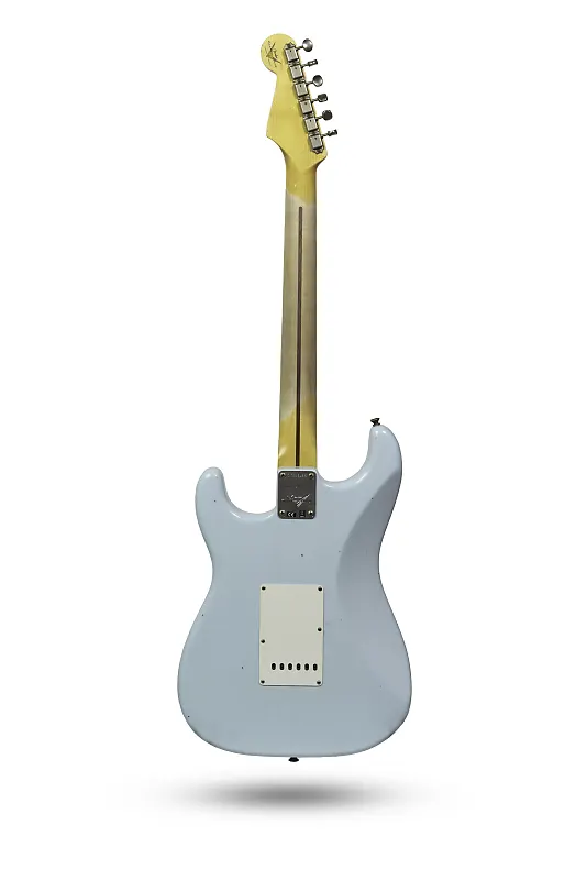 Fender Custom Shop '57 Stratocaster Journeyman Relic в выцветшем цвете Sonic Blue. Ограниченная серия, корпус из ольхи, цельный кленовый гриф с радиусом 9,5" и ладами 6105. Профиль грифа Soft V, ручная намотка звукоснимателей Fat 50's