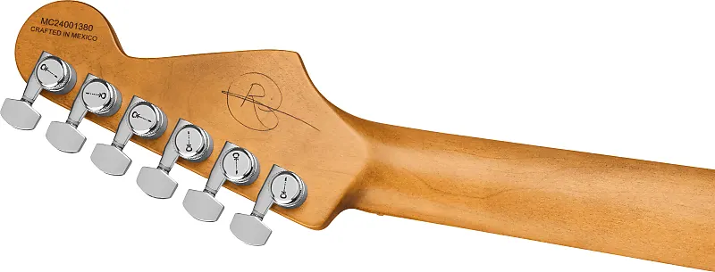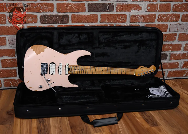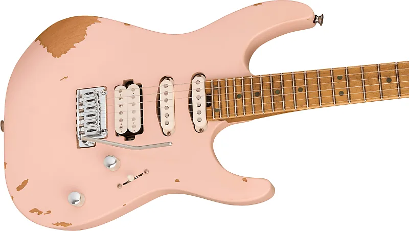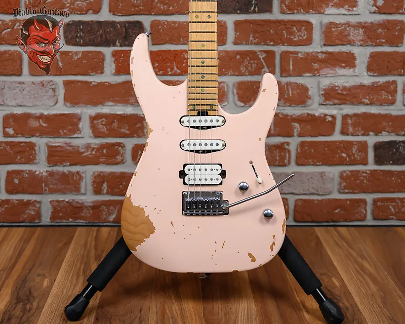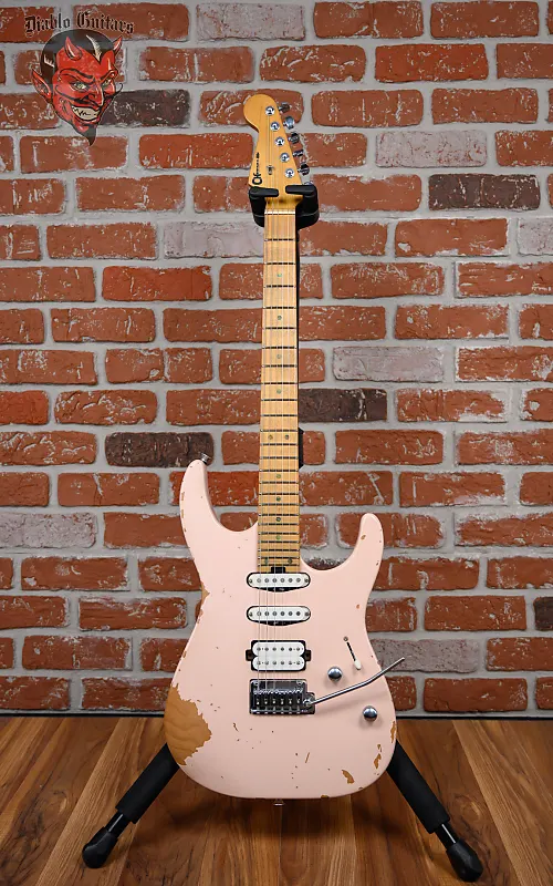 Новая гитара Charvel Pro-Mod Signature Rick Graham DK24 2PT CM в отделке Worn Shell Pink, изготовленная в 2025 году, с оригинальным футляром Polyfoam. Эта гитара имеет корпус из цельного ольхи, гриф и накладку из клена с перевернутой лицензированной головой Fender. Оснащена кастомным сингл-койлом Charvel с пергаментной крышкой на позиции хамбакер/середина и кастомным хамбакером Charvel с пергаментной крышкой на позиции мост. Управление производится с помощью 1 регулятора громкости, 1 регулятора тембра и 5-позиционного переключателя с функцией coil-tap. Длина грифа составляет 25,5", в нем черные точечные вставки и светящиеся боковые метки Luminlay на 22 джамбо ладах с комбинацией радиуса 12"-16" и скоростным профилем. Фурнитура состоит из хромированных колков Charvel с запечатывающимися механизмами и крышками Cloche, керебра Graphtech Tusq XL на порожке, тремоло Gotoh custom 510 и хромированных рифленых куполообразных ручек.