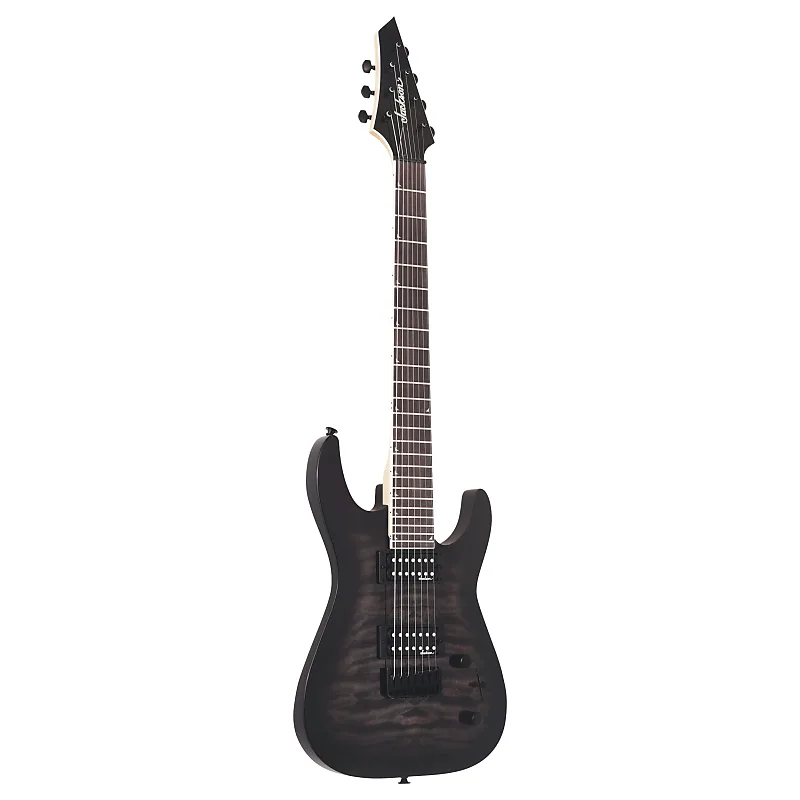 Внушительный 7-струнный зверь, JS Series Dinky Arch Top JS22Q-7 DKA HT, выполнен в мрачном прозрачном черном градиенте с полностью черной фурнитурой и нашей черной головой грифа Jackson 3x4 AT-1.