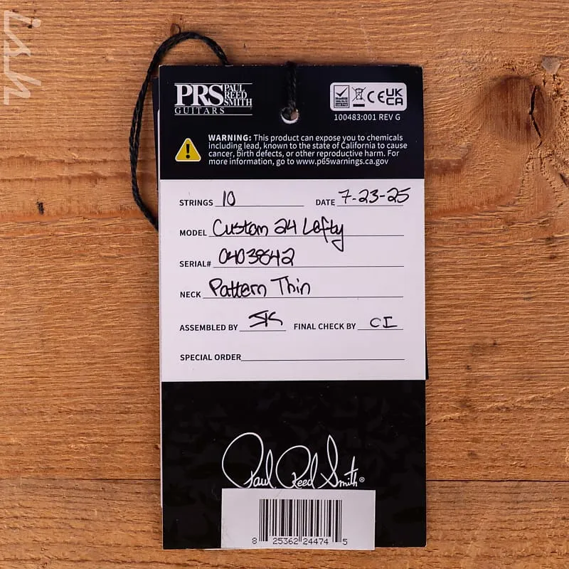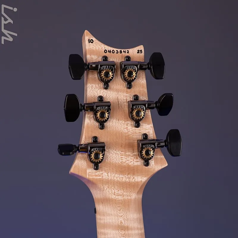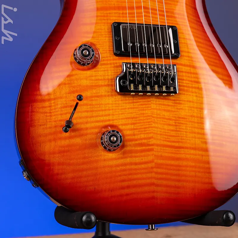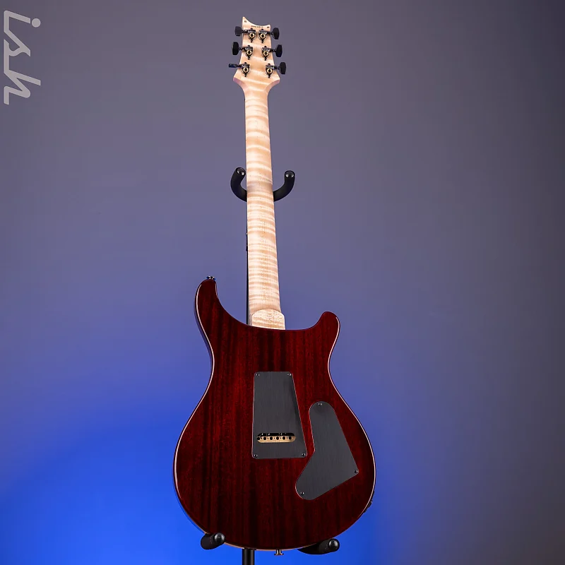 Эта гитара Wood Library Custom 24 Lefty имеет некоторые индивидуальные особенности, такие как гриф из фигурного клена, накладка на гриф из клена, фурнитура цвета «Smoked Black» и отделка Cherry Sunburst.