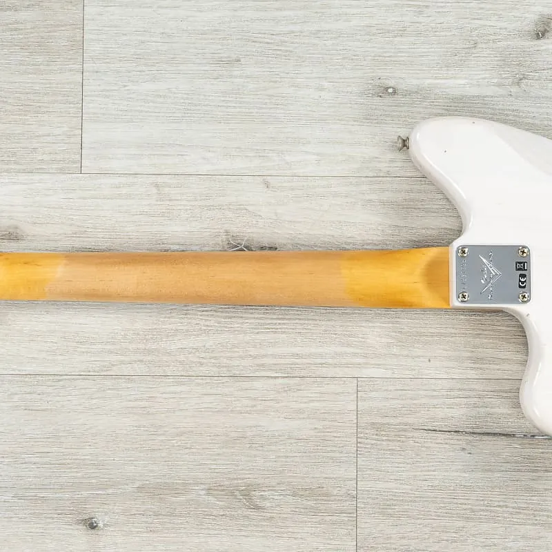 Гриф из рифленого клена имеет профиль Jazzmaster «C» образца 1962 года и украшен накладкой из розового дерева с радиусом 9,5 дюйма гриф с 21 узким высоким ладом (6105) и костью для верхнего порожка. Чтобы добавить больше винтажного шарма, установлена однослойная золотистая анодированная алюминиевая защитная накладка для пикгварда (ценная деталь ранних моделей Jazzmaster), два намотанных вручную настраиваемых звукоснимателя ’62 Jazzmaster от Custom Shop с трехпозиционным переключателем звукоснимателей, винтажная двухцепочная проводка (лид/ритм), а также, в особом современном штрихе, потенциометры громкости и тембра на 250 кОм, которые улучшают звучание и удобство игры.