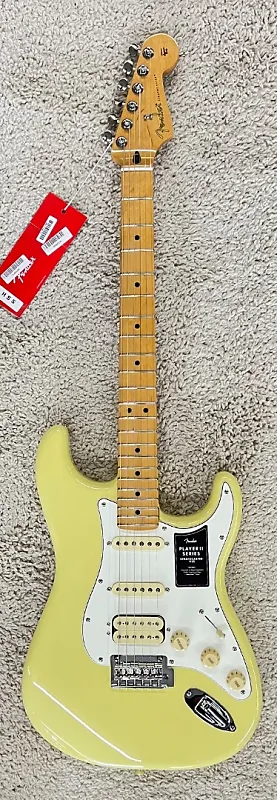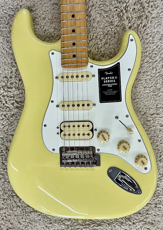 Fender Player II Stratocaster HSS, гриф из палисандра, цвет Hialeah Yellow - MIM Совершенно новая модель к концу июля 2024 года! Butler Music теперь предлагает все 79 моделей новой серии Player II, при этом у нас в наличии несколько экземпляров большинства моделей. Для точного отображения качества этих обновленных моделей мы будем использовать реальные фотографии каждой размещенной гитары, а также отправлять их настроенными и готовыми к игре, включая указание веса каждой гитары или баса, чтобы вы точно знали, что получаете. У этой модели серийный номер MXS24016070 и весит она 7 фунтов 4,40 унции. Новая серия Player II развивает чрезвычайно популярную формулу Player. Новые особенности Player II включают никогда ранее не использовавшиеся винтажные автоцвета, грифы из палисандра, улучшенные мосты и фурнитуру, закругленные края грифа, новый оттенок шеи, состаренные пластиковые детали, а также новые варианты древесины корпуса с резонансной полостью из ясеня и полостью из махагони. Сохраняя суть того, что сделало оригинальная серия отличная - звукосниматели Player, современные шеи формы „С“, гриф радиусом 9,5 дюйма и ладовые порожки среднего джамбо, новая серия Player II расширяет эту прочную основу, предлагая широкий спектр обновлений и новых опций. Разработанная для музыкантов, готовых сделать следующий шаг в своем музыкальном пути, серия Player II устанавливает новый стандарт доступного качества и производительности. Вот некоторая информация об этой конкретной гитаре.Корпус - Ольха Отделка корпуса - Желтый блестящий Hialeah, полиэстер Гриф - Клен - современная форма „С“ Отделка грифа - сатиновый уретан на тыльной стороне грифа и глянцевый уретан на лице головки грифа Грифовая накладка - Палисандр, радиус 9,5 дюйма (241 мм) Лады - 22, средний джамбо Маркерные точки - Белые точки Материал и ширина порожка - синтетическая кость, 1,650” (42 мм) Колки - классические колки Fender Длина мензуры - 25,5” (64,77 см) Мост - двухточечный синхронизированный тремоло с изогнутыми стальными седлами Защитная накладка - трехслойная пергаментного цвета Звукосниматели - Humbucker серии Player Alnico 2 бриг, синглы Player II Series Alnico 5 Strat на среднем и шейном положении Переключатель звукоснимателей - 5-позиционный Регуляторы - Общая громкость, Тембр 1, Тембр 2 Ручки - Пластик состаренного белого цвета Фурнитура/Отделка - Никель/Хром Струны - Fender USA 250L, никелированная сталь, 0.009-0.042 Чехол или сумка - НЕТ