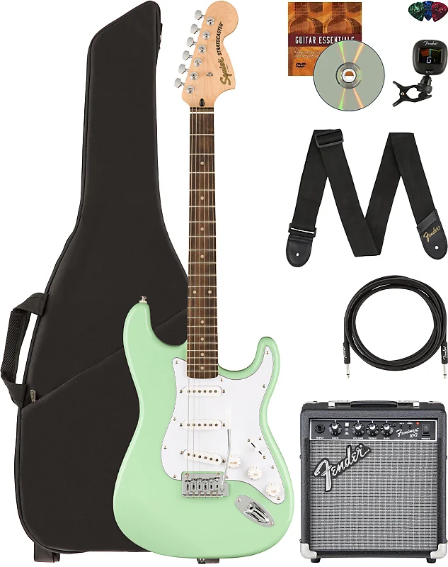 Fender Squier Affinity Stratocaster - комплект Surf Green с усилителем Frontman 10G, чехлом для переноски, кабелем для инструмента, тюнером, ремнем, медиаторами и обучающим DVD от Austin Bazaar.