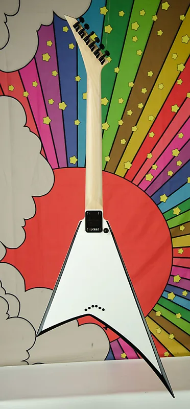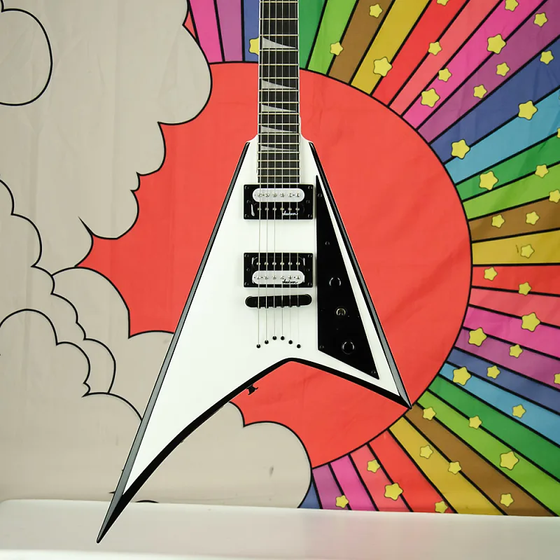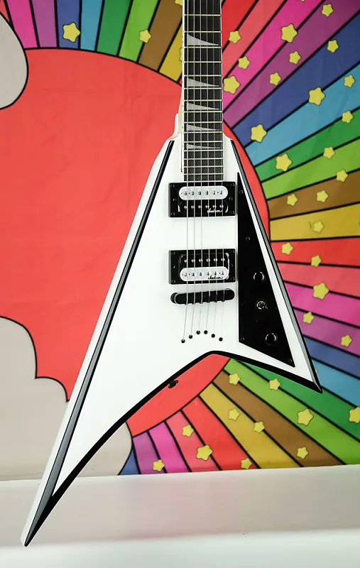 Этот проверенный временем гитарный инструмент с угловатым дизайном доступен в сатиново-черном или белом цвете с черными скосами и завершен черным звукоснимателем и черной фурнитурой.