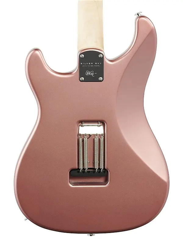 Некоторые из более отличительных характеристик PRS Silver Sky - это форма головки грифа, колки, мост, звукосниматели, а также варианты грифа и накладки. Форма головки основана на фирменном дизайне Пола Рида Смита, но инвертирована, чтобы соответствовать стилю игры Мейера и сохранить последовательность. длина струны за гайкой, что облегчает настройку.