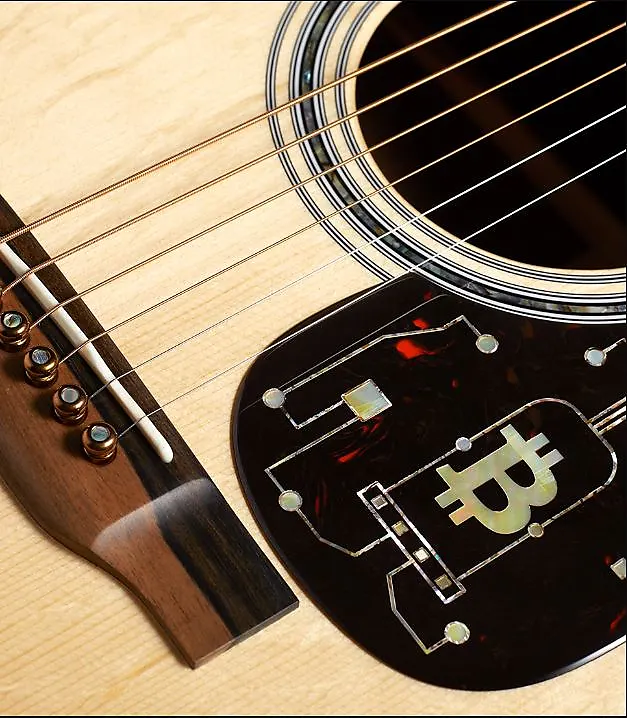 Компания Martin Guitar существует с ранних дней валюты США и до сих пор на рынке. Эта модель создана в честь новейшей мировой валюты - биткоина. В головке грифа вмонтирована золотая монета массой один унций. Также имеются уникальные инкрустации на грифе и головке грифа. Задняя часть и обечайки сделаны из гватемальского палисандра, поэтому вы получите богатый бас и громкость от этой гитары; при этом она сочетает музыку с елью Энгельманна, которая легче большинства верхних пород дерева и может прийтись по вкусу. для музыкантов, которые любят играть мягко, не теряя при этом сложность звучания. Эта гитара станет прекрасным дополнением к арсеналу любого коллекционера играбельных гитар.
