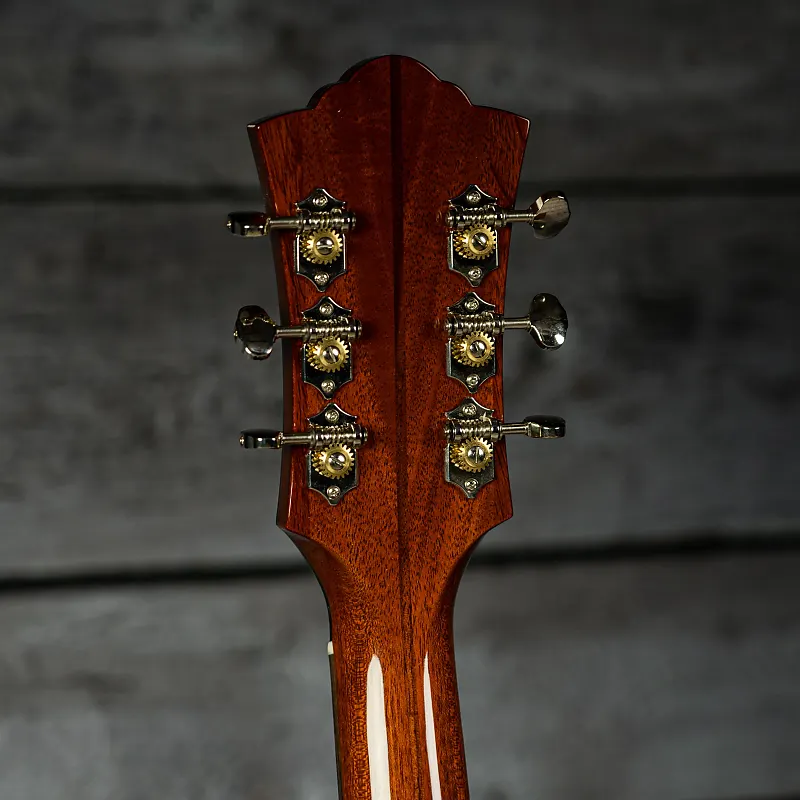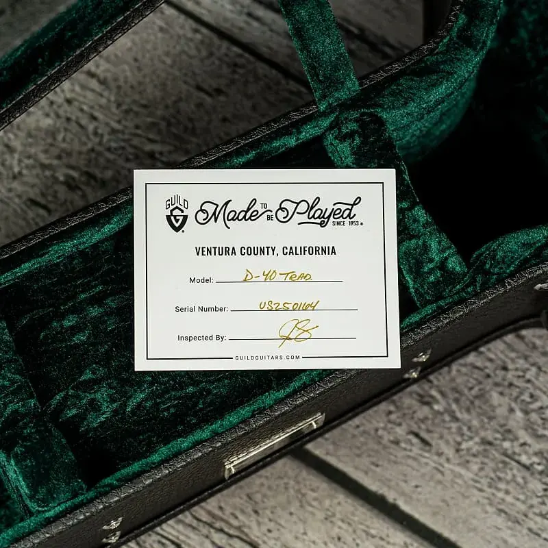 "Guild D-40 Traditional воплощает в себе особенности, которые сделали D-40 одной из самых любимых и уважаемых моделей компании Guild. Используя верх из высококачественной массива ели Ситка и заднюю часть с обечайками из массива африканского махагона, Guild добавляет волнообразные подклеенные бруски Adirondack для мощности, нюанса и отзывчивости. Шея D-40 Traditional из трех частей махагона и ореха покрыта грифом из индийского палисандра и соединена с корпусом с использованием аутентичного ласточкиного хвоста.