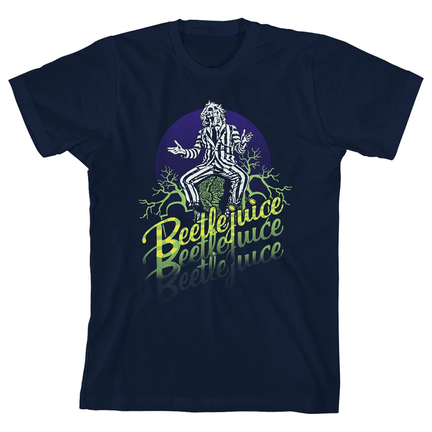 Ему понравится демонстрировать свою любимую франшизу и стиль в этой футболке с рисунком Beetlejuice для мальчиков.