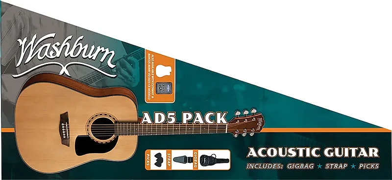 Washburn AD5CEPACK - это акустическая гитара типа Dreadnought с вырезом, верхом из отборной ели, корпусом из махагони, черной окантовкой и встроенной электроникой. В комплект входит все необходимое для начала игры: чехол, ремень и медиаторы.