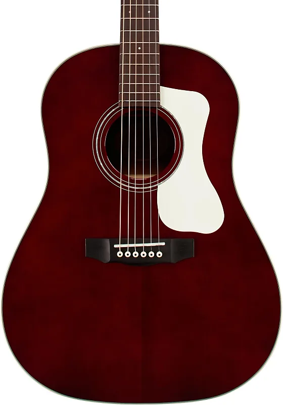 6-струнная акустическая гитара с верхней декой из ели, задней частью и сторонами из махагони, грифом из махагони и грифовой накладкой из пау ферро - винно-красного цвета.
