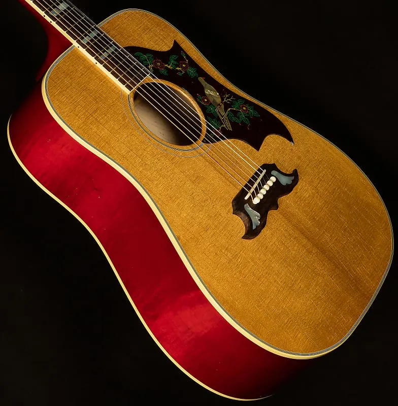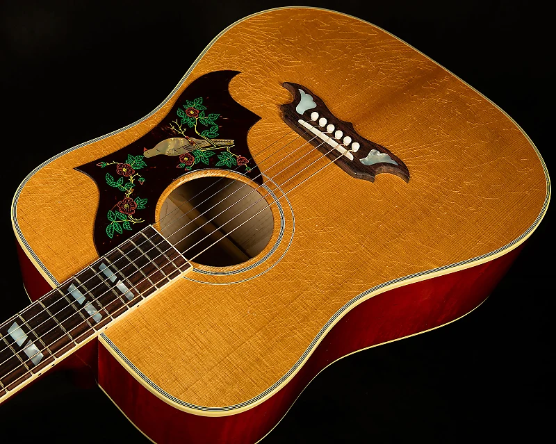1963 Dove Light Aged имеет верхнюю дека из термически состаренной ели Ситка с традиционной «X»-балкой с вырезами (scalloped X-bracing), что помогает придать ей тон звучания хорошо выдержанная винтажная гитара с прекрасно прожженной спинкой и боковыми панелями из клена, покрытыми вишневым лаком. Гриф из махагони имеет удобный профиль Round и оснащен грифовой накладкой из индийского палисандра с 20 стандартными ладами, украшенными инкрустацией из перламутра в виде параллелограмма. Более длинная мензура 25,5 дюйма в сочетании с корпусом из клена придает модели Dove характерный звук, который немного громче и ярче, а также полнее, чем более среднечастотный тон модели Hummingbird.
